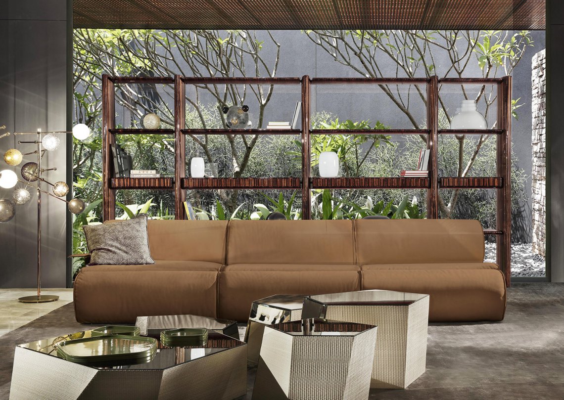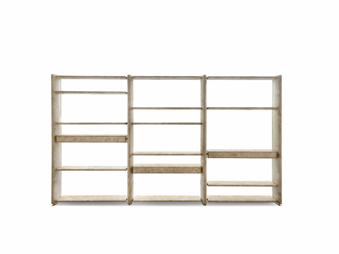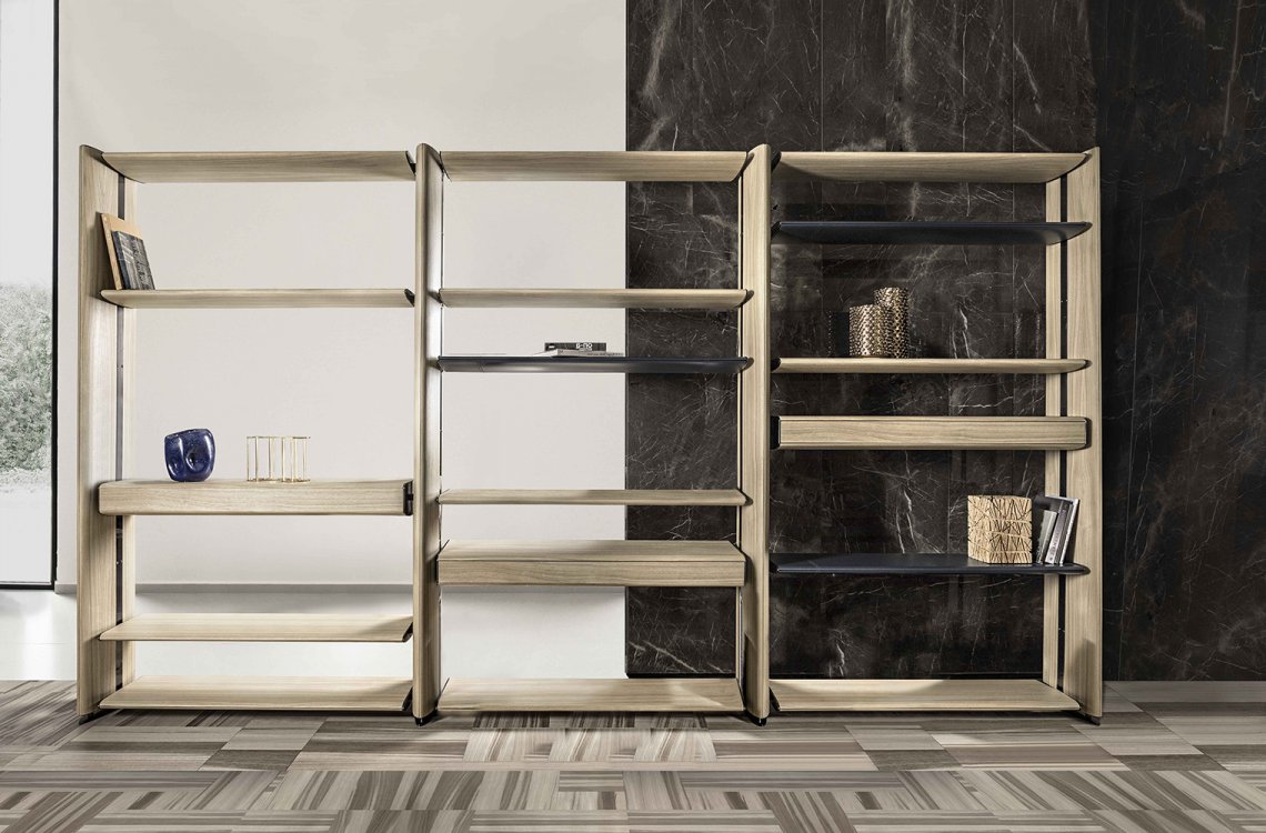 Eclipse is a modular bookcase designed to suggest a contemporary element to divide big living areas. Its soft lines make it suitable to furnish many different areas and the refined oval-shaped structure envelops the shelves supported by decorative metal details. It’s available with ebony, root poplar and oak wood.