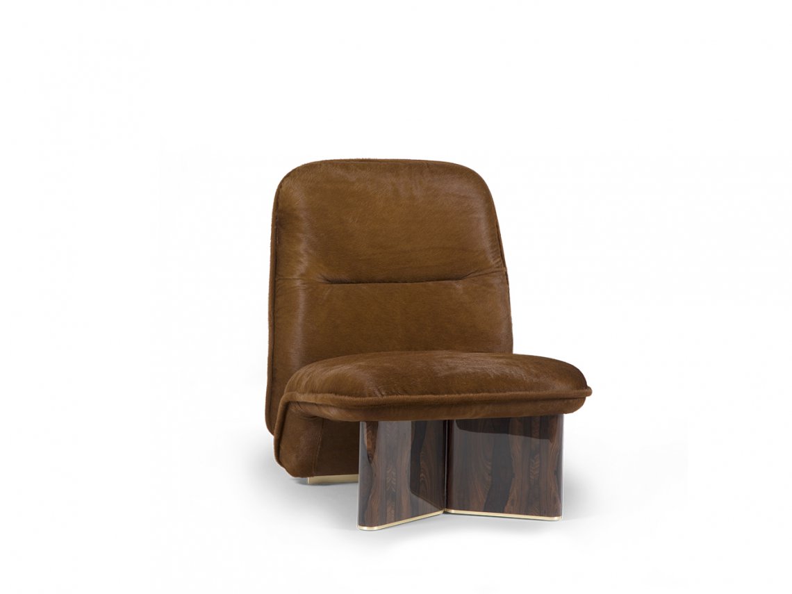 The armchair Ypsilon is the result of the union of two upholstered elements, seat and backside that are perfectly symmetrical. The bovine leather with pony look covers the whole structure. The same ypsilon shape is also recognizable in the base covered with precious ziricote wood and metal details in matt gold finish.