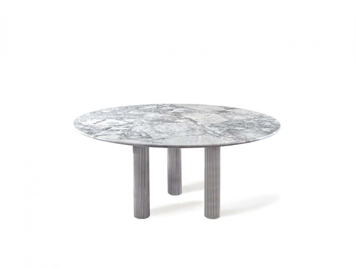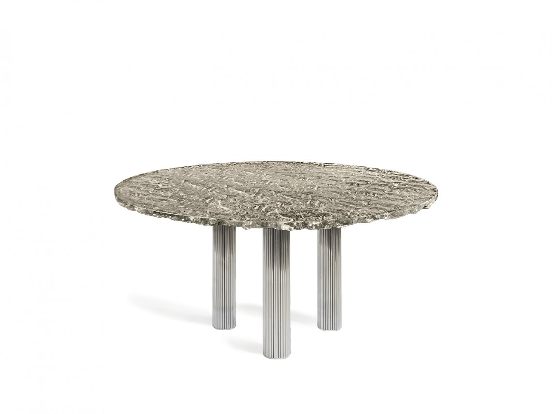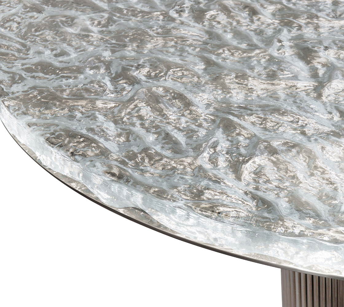 For many years, our company has been glad to cooperate with the Masters of glass art in the Venice area. Miller collection of tables is the perfect result of the ability of these artists, who learnt the ancient Murano working techniques and have handed them down from generation to generation. The glass top was born from the desire to experiment with a completely unconventional product, reinterpreting a millennial tradition in a modern key. The production difficulties inherent in a casting process aimed at obtaining a large and thick glass top, make this piece a truly unique element. The top is supported by a metal plate that accentuates the reflections of the lower part of the glass, resembling sea ripples. The table top is supported by three cylindrical legs covered with thin chrome metal rods.