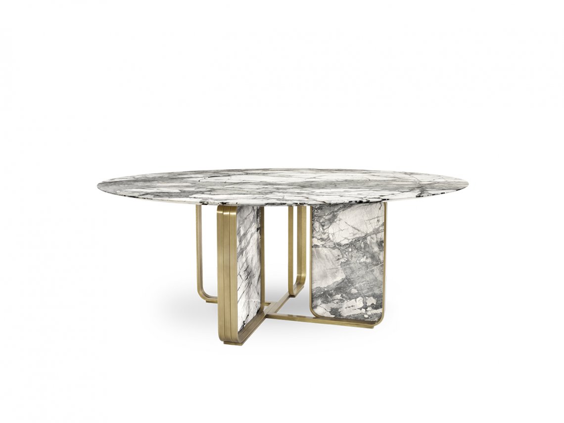 The uniqueness of round tables Nova is represented by the brass base that envelops the marble slabs like a ribbon, enhancing the natural veins of the stone. The metal parts, that are shaped in a very precious way, are proposed both in shiny and matt finishes and some of them are decorated by hand with a refined three-dimensional effect. Besides the round table, that can be selected with lazy susan, exists also the rectangular version.