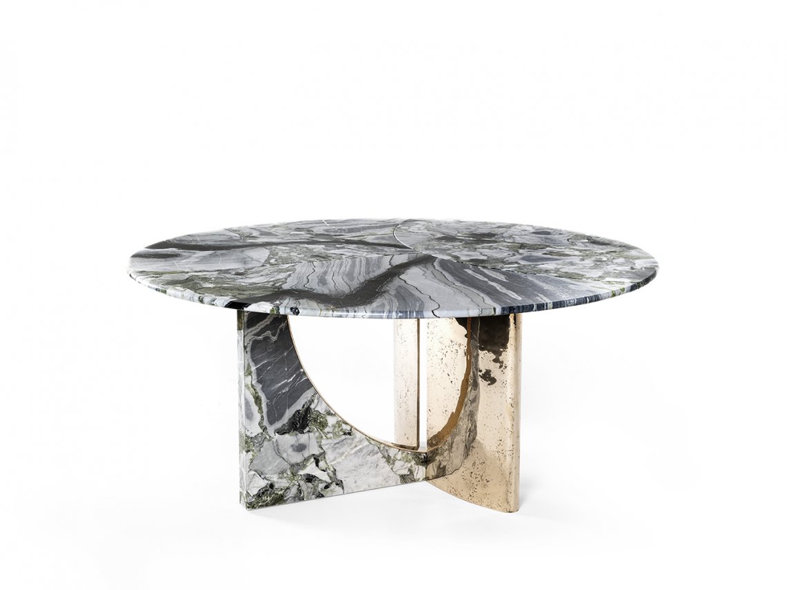 The shapes of dining table Spinnaker take inspiration from elegance and lightness of the sails of the boats that are unfurled to the wind during the sailing. The marble top is available in one unique piece or it can be cut into three curved parts following the structural base with two arches that recall the typical geometry of architecture of the Thirties. The melted bronze parts of the base are realized by casting liquid metal into a mold made of special sand. The White Beauty marble creates a very strong chromatic contrast with the bronze shades of the metal, enhancing the refinement of all the materials used for this table.