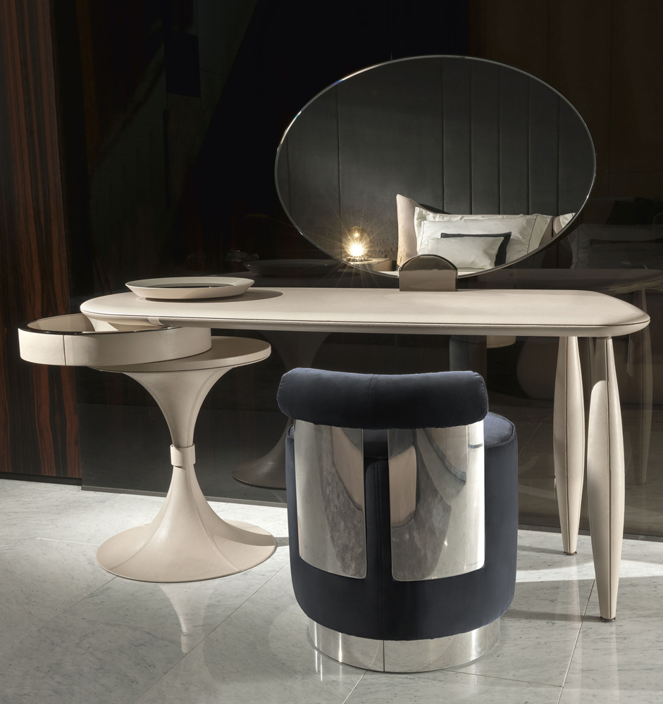 The colour and small dimensions of the cylindrical pouf Shelly make this item suitable for an elegant and refined living area. Available both in leather and fabric and in two different heights, this small armchair finds its best expression thanks to the printed leather with “pony” look.