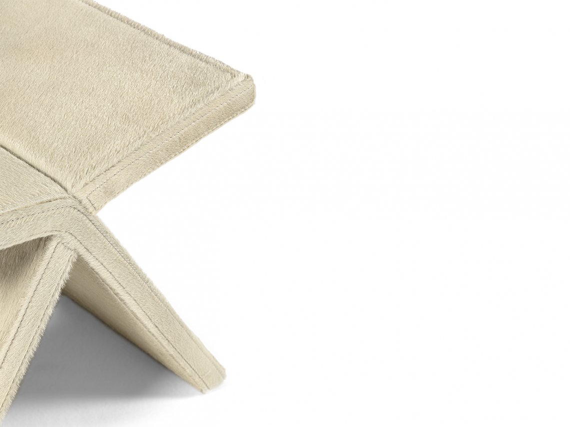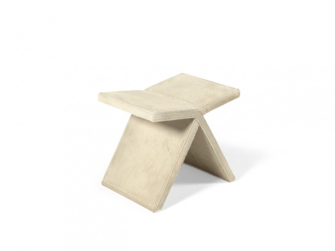 The pouf Voyage is only available with bovine leather with Pony look and it has a design that recalls an outdoor stool. The pouf is characterized by two curved elements that join at the seat.