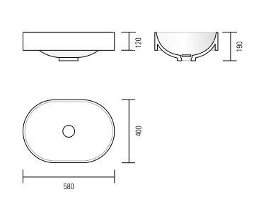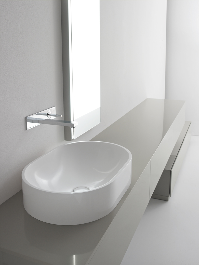 Lavabo da appoggio semi incassato, in Monolith, senza troppo pieno, tappo piletta in Monolith.