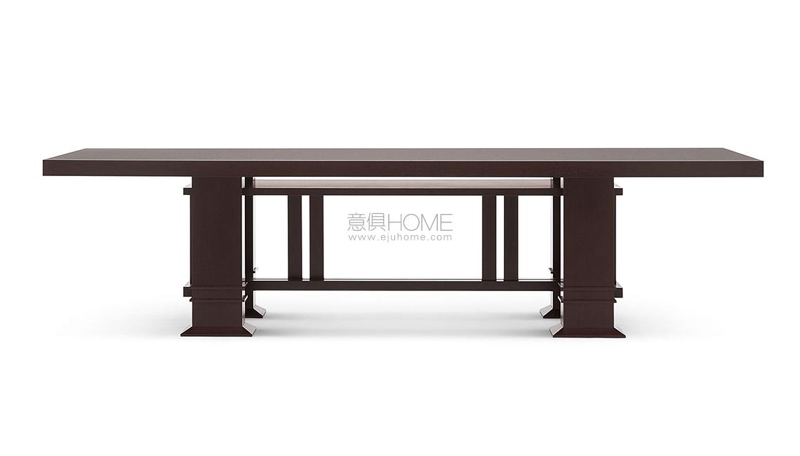 Frank Lloyd Wright progetta questo tavolo da pranzo nel 1917, per la casa del governatore e senatore del Kansas Henry J. Allen, riconosciuta come uno degli ultimi esempi di modulo unifamiliare in stile praire house. Il suo profilo sostanziale e possente rivaluta il concetto di spazio senza tralasciare il riferimento alla tradizione, come dimostrato dall’eleganza stilistica della forma rettangolare in legno. La struttura è disponibile in ciliegio naturale, tinto noce o noce canaletto, con due diverse lunghezze di piano corrispondenti alle dimensioni originali.