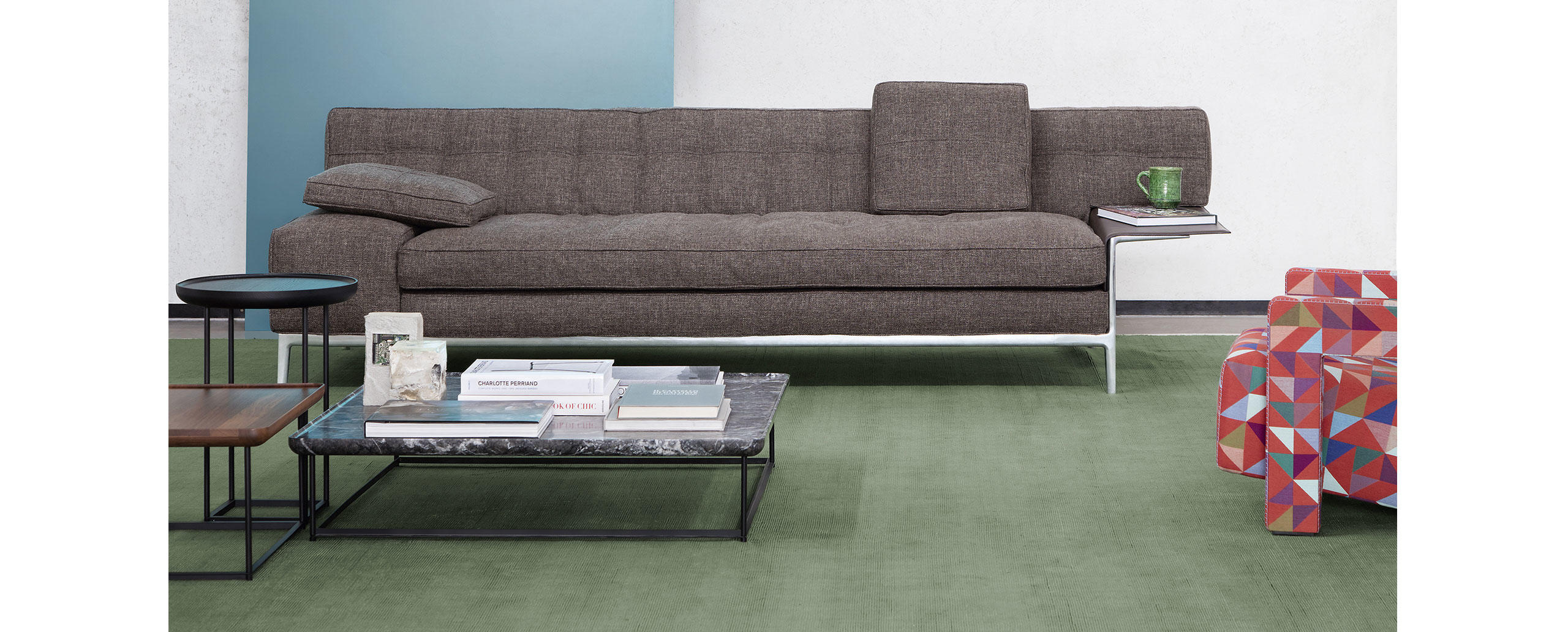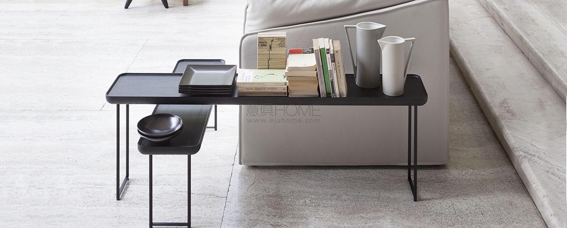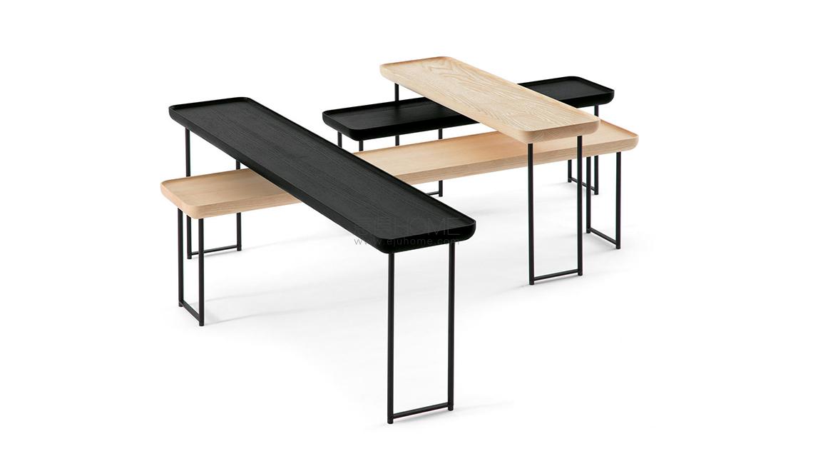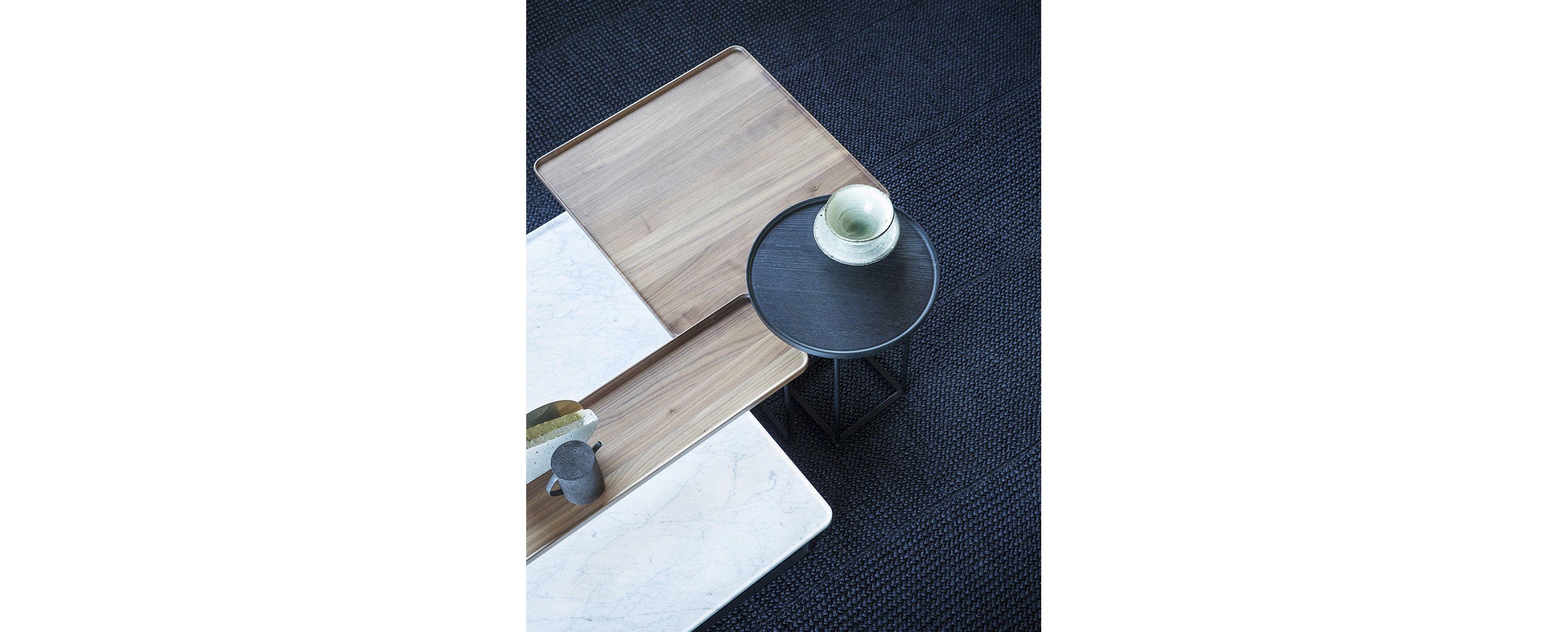 Eleganza e versatilità contraddistinguono una collezione di tavolini in continua evoluzione, facilmente intersecabili e combinabili in base allo spazio e alla destinazione d’uso. Il richiamo all’essenzialità giapponese si rivela nel minimalismo delle geometrie tonde, quadrate e triangolari, declinate in frassino naturale e in tre tipologie di marmo che includono il bianco Carrara, il nero Marqui?a e il grigio Carnico. Le diverse altezze e forme si uniscono e alternano per costruire piccole architetture d’appoggio che esprimono una particolare propensione all’ospitalità e alla condivisione.