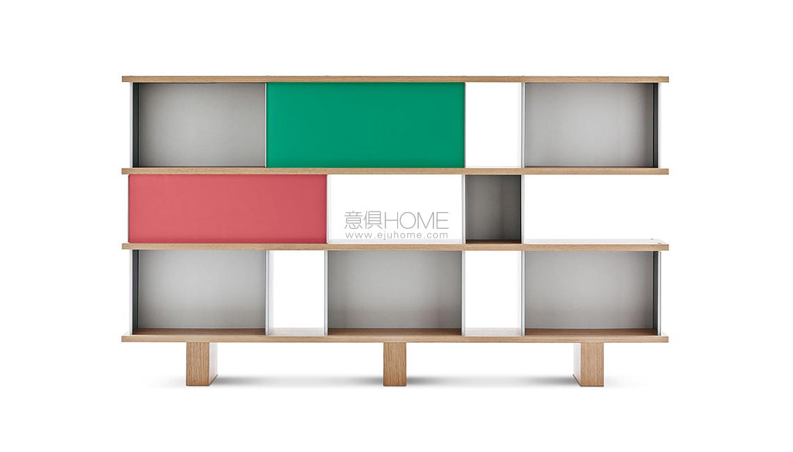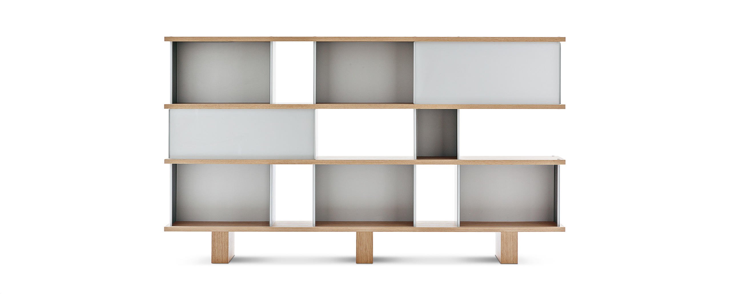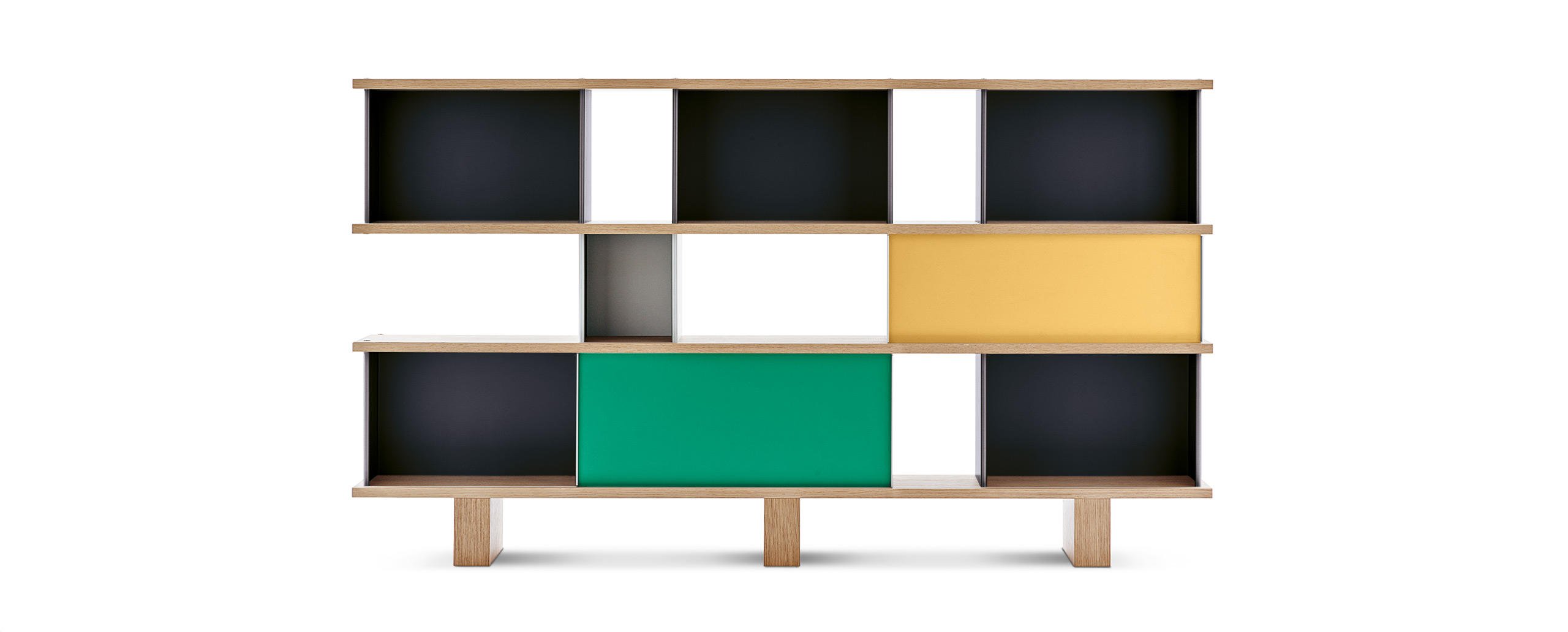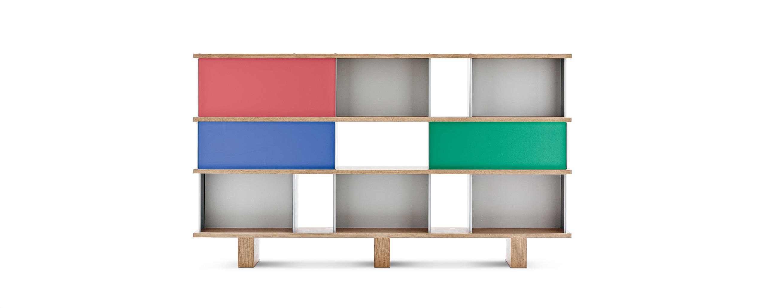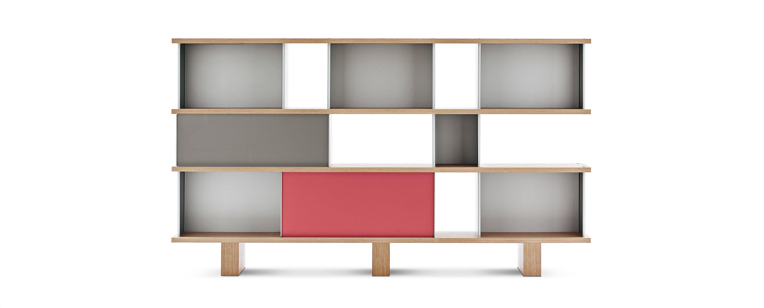 Autenticità e avanguardia caratterizzano il progetto ideato da Charlotte Perriand nel 1940, dopo aver notato della mensole disposte a forma di nuvola sui muri del Palazzo Imperiale di Kyoto. Da qui Perriand derivò il suo personale concetto di modularità libera, rigorosamente fondata sulla funzionalità, sull’estetica e sulla fruibilità dell’oggetto. Il design asimmetrico e il principio della combinabilità consentono usi molteplici in ambienti differenti, svelando varie tipologie che spaziano dalle credenze ai contenitori, dalle librerie a muro alle composizioni appese fino alle strutture autoportanti da collocare al centro della stanza. I moduli con ante a chiusura, disponibili in alluminio anodizzato o in una vasta scelta di colori, liberano l’immaginazione suggerendo un gioco di alternanze visive tra i pieni e i vuoti.