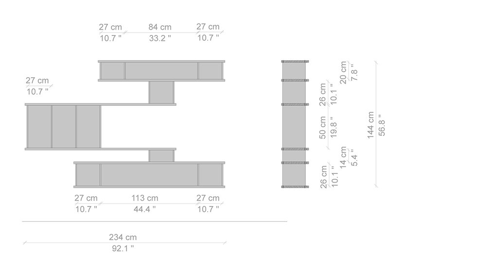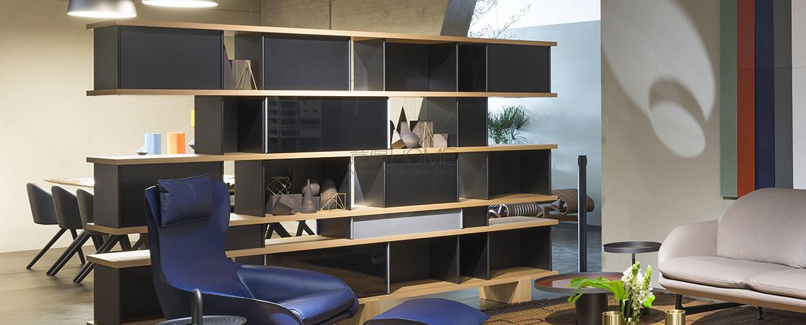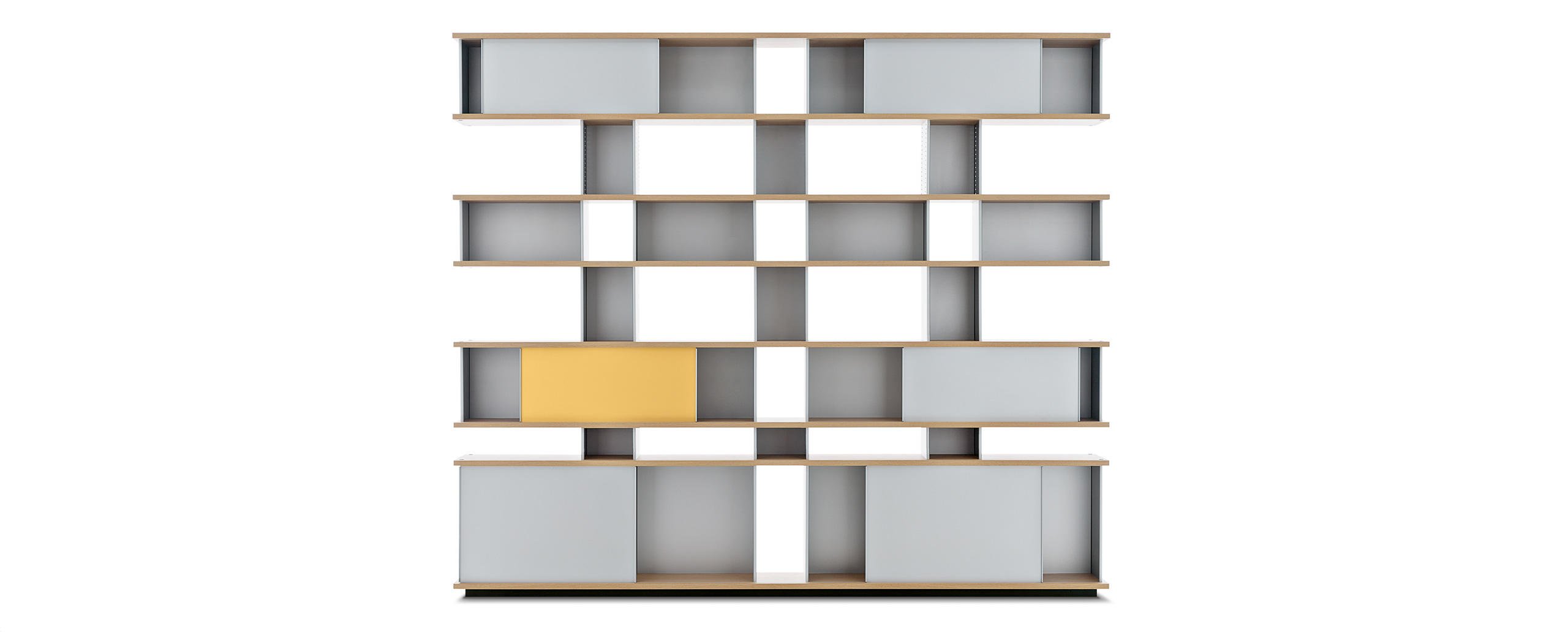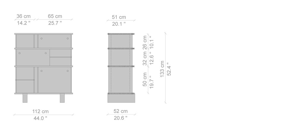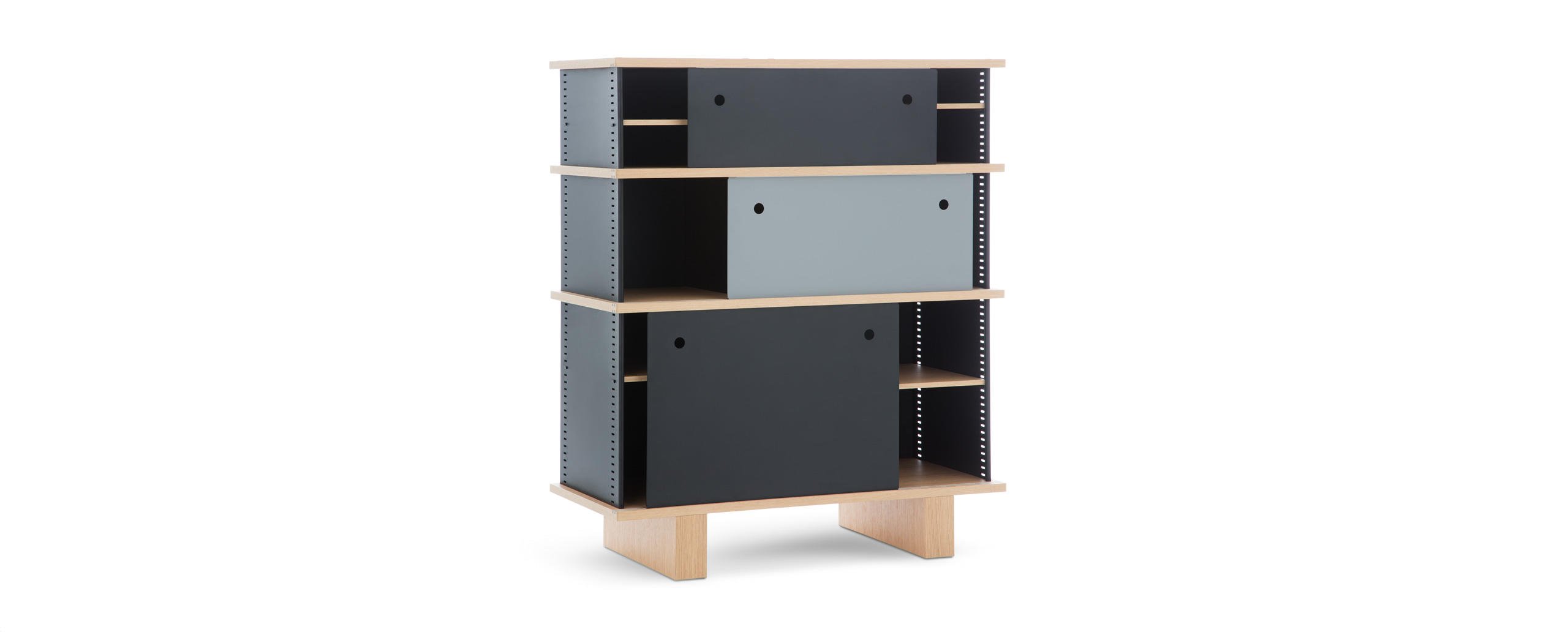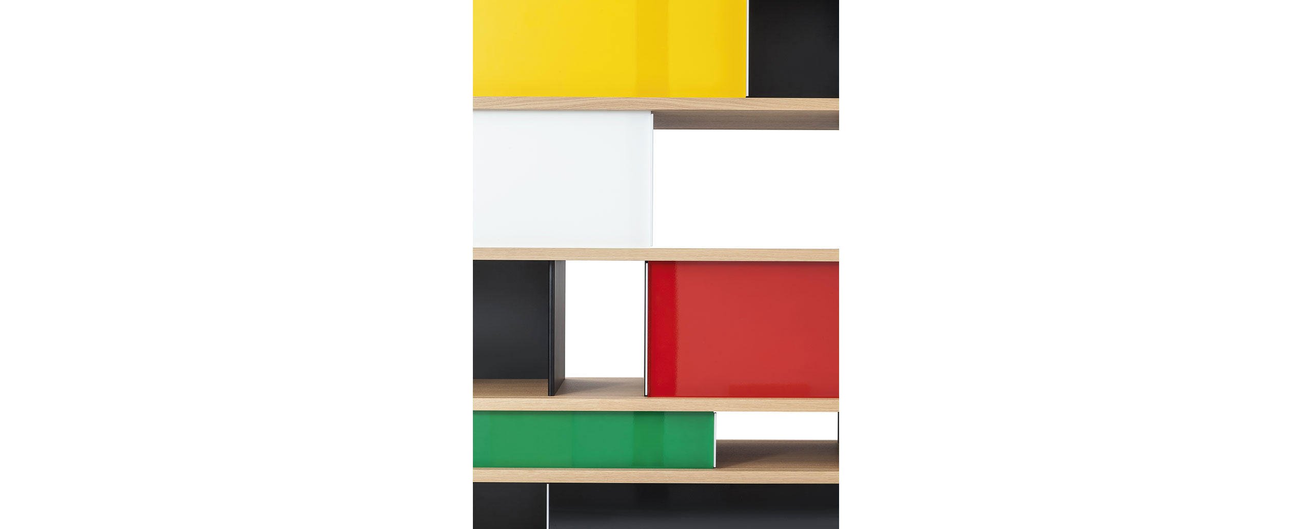 Autenticità e avanguardia caratterizzano il progetto ideato da Charlotte Perriand nel 1940, dopo aver notato della mensole disposte a forma di nuvola sui muri del Palazzo Imperiale di Kyoto. Da qui Perriand derivò il suo personale concetto di modularità libera, rigorosamente fondata sulla funzionalità, sull’estetica e sulla fruibilità dell’oggetto. Il design asimmetrico e il principio della combinabilità consentono usi molteplici in ambienti differenti, svelando varie tipologie che spaziano dalle credenze ai contenitori, dalle librerie a muro alle composizioni appese fino alle strutture autoportanti da collocare al centro della stanza. I moduli con ante a chiusura, disponibili in alluminio anodizzato o in una vasta scelta di colori, liberano l’immaginazione suggerendo un gioco di alternanze visive tra i pieni e i vuoti.