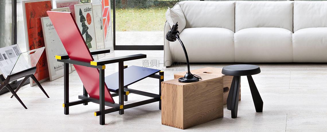 Una sedia-scultura dalla forma pura e razionale. Un autentico manifesto dell’approccio oggettivo del Neoplasticismo, promosso dal movimento olandese De Stijl nel 1917. Una poetica incoraggiata anche da Piet Mondrian, il cui obiettivo era la ricerca della natura essenziale delle cose, l’equivalenza armonica dei colori e l’uso esclusivo dell’angolo retto. Rietveld lavora ai primi prototipi nel 1918, esprimendo la filosofia di organizzazione dello spazio attraverso la monocromia degli elementi. In seguito applica la differenziazione cromatica per separare le parti costruttive in base alle funzioni, arrivando ad accostare la struttura nera alle parti di appoggio colorate. Da qui anche la variazione del nome dell’opera, che da Slat Chair divenne Red and Blue.