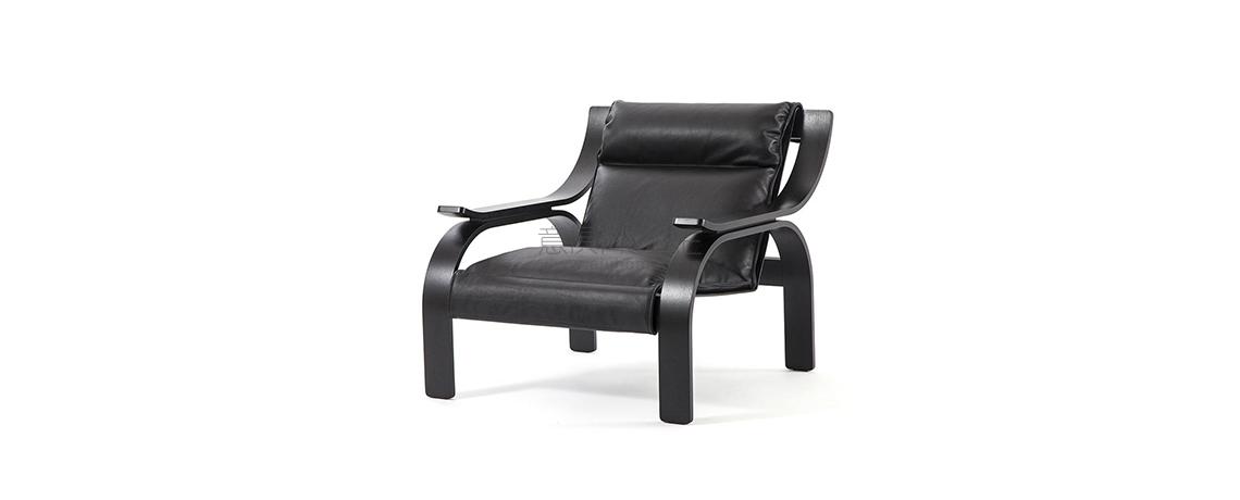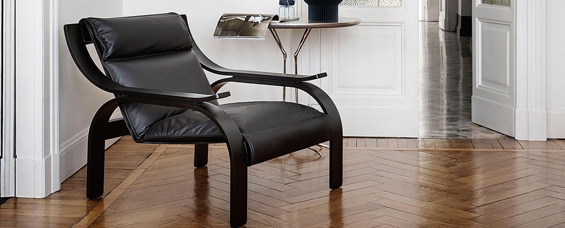 Una poltrona dal design deciso e rigoroso, sviluppata da Zanuso attraverso una ricerca sulla possibilità di ancorare un elemento di seduta ad una struttura portante in legno. Lo studio fu inizialmente compiuto nel 1949, per il concorso internazionale di design al MoMA di New York, e successivamente ripreso nel 1964 facendo leva sulla tecnologia avanzata di Arflex. Lo scheletro in legno è progettato partendo da una matrice basata sulla geometria del cerchio, che conferisce alla seduta un’estetica elegantemente formale. Disponibile in un’edizione iconica con struttura in noce tinto noce, pannello in cuoio beige e cuscinatura in pelle color tabacco.