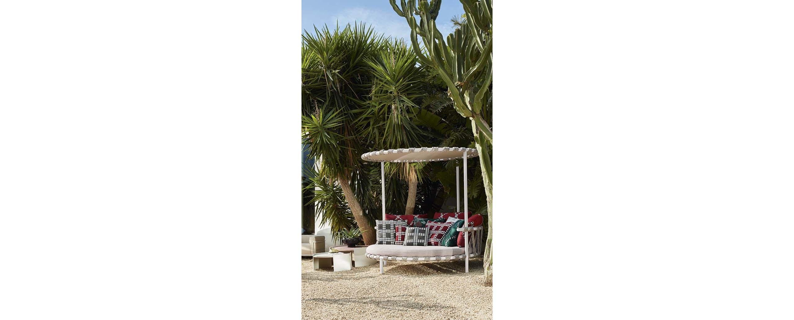 Patricia Urquiola interpreta la felicità della vita all’aria aperta con un prodotto di forte impatto, ispirato ai piccoli trampolini presenti nei giardini delle case in Groenlandia. Trampoline è un love bed con struttura in acciaio Inox AISI 304 verniciato, scenografico ed elegante, dalle forme morbide e giocose, perfetto per popolare accoglienti spazi open air; un’isola di relax e comfort grazie a un set di tre cuscini per lo schienale e a due tipologie di cuscini aggiuntivi, tutti in poliuretano espanso ricoperto con morbida ovatta di poliestere e rivestiti da tela idrorepellente. è disponibile sia in versione divano basso sia divano con baldacchino – per ripararsi dal sole –, entrambi caratterizzati dall’intreccio realizzato a mano in corda di polipropilene e nylon, in mélange o in multicolore, che avvolge la base e lo schienale, e che diventa decorazione distintiva.