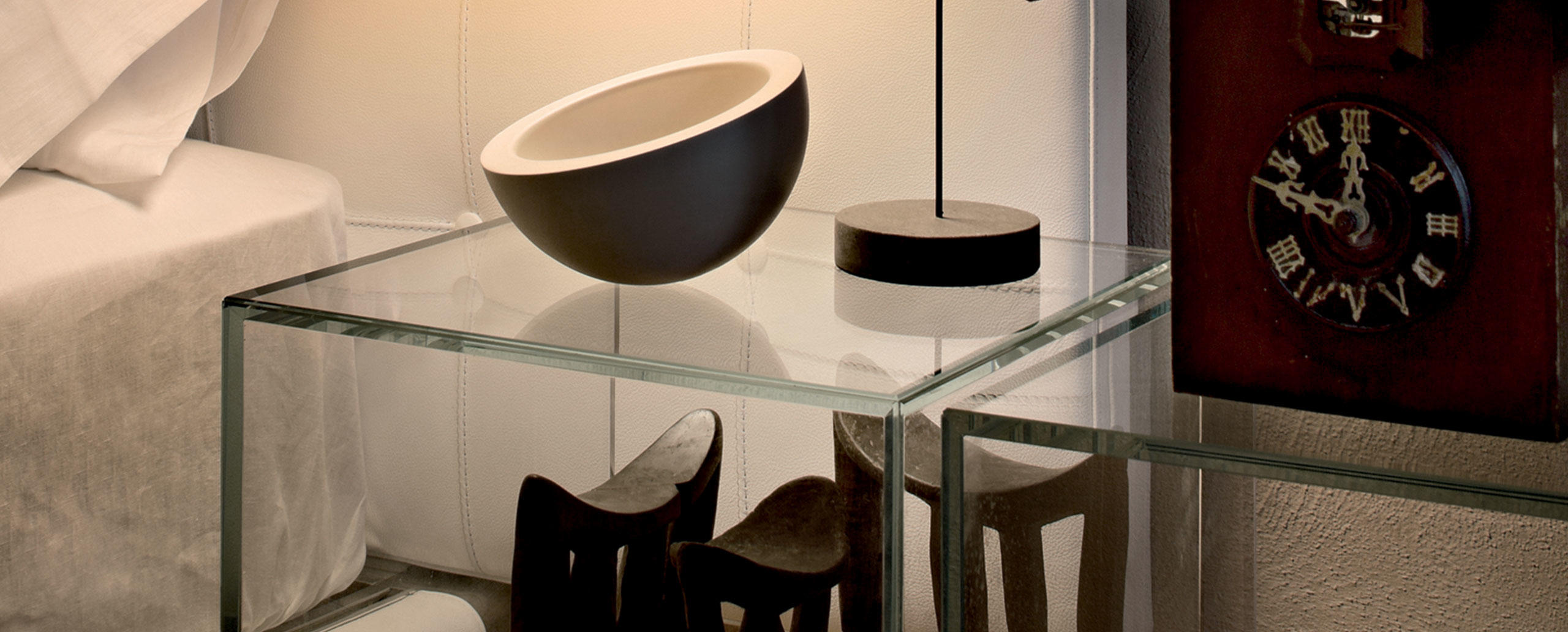 Da abbinare al letto disegnato da Philippe Starck, il comodino Volage è un parallelepi-pedo in vetro extrachiaro con base in acciaio cromato. Aperto sul fronte, può essere usa-to come bedside table o come contenitore. Completano la collezione il letto e una panca.
