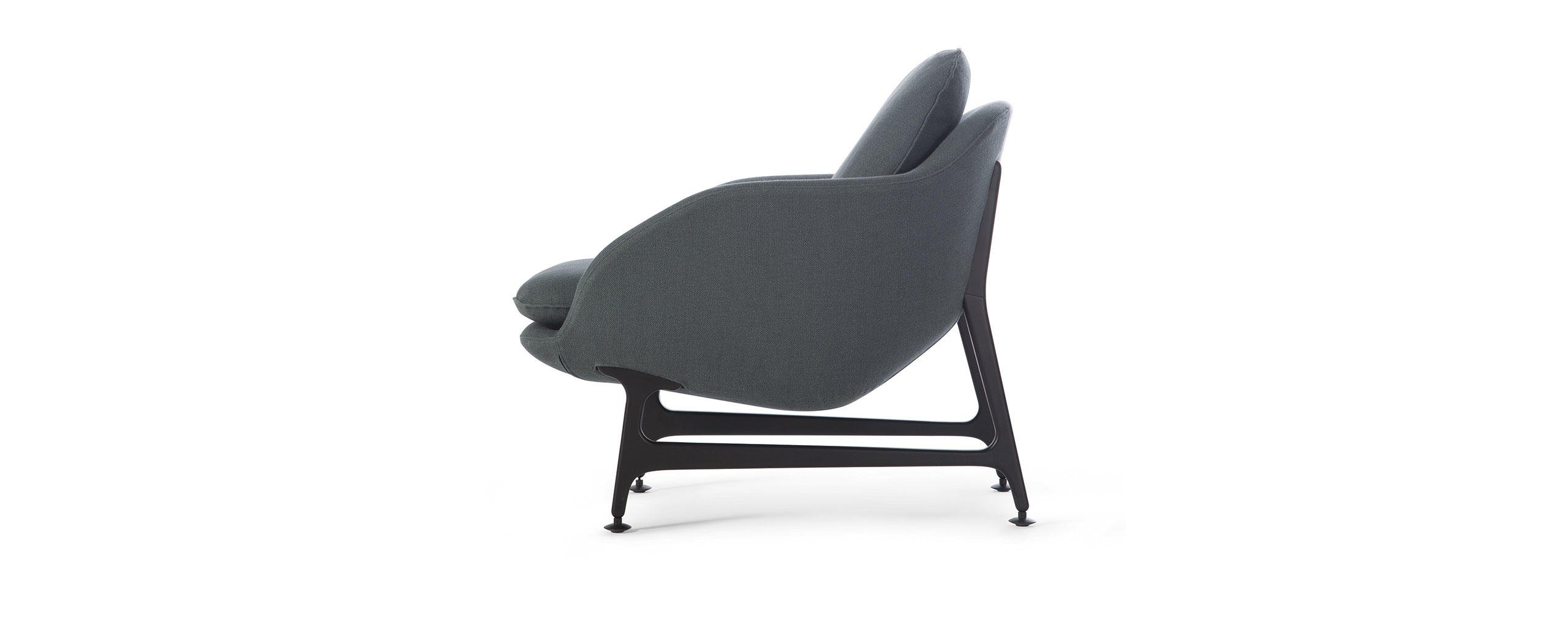 Poltrona, divano a due posti e divano a tre posti. Scocca in poliuretano espanso, privo di CFC, con cinghie elastiche, rivestita in tessuto o pelle amovibile. Basamento in fusione di alluminio lucido, oppure alluminio verniciato nei colori nero opaco o bronzo satinato. Piedini in materiale plastico. Cuscini di seduta in poliuretano espanso e ovatta di poliestere.