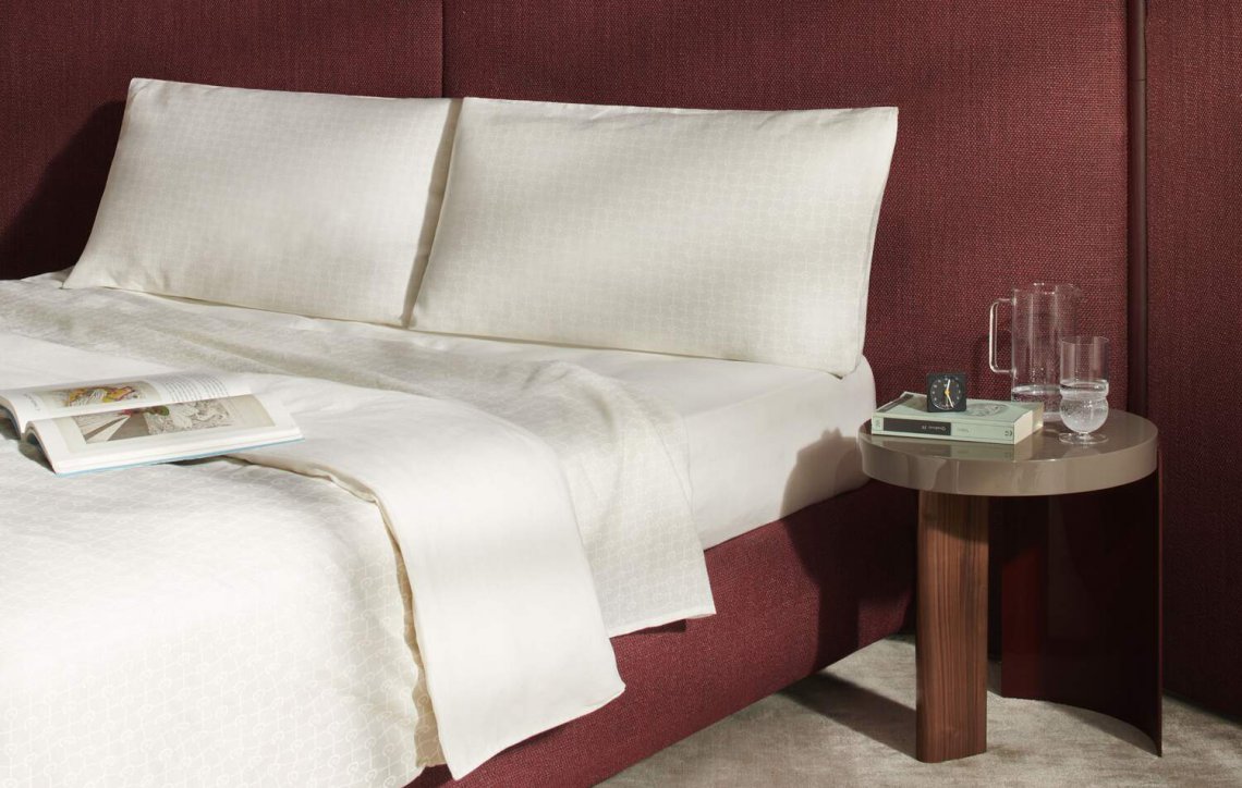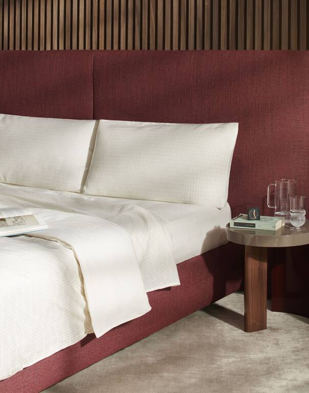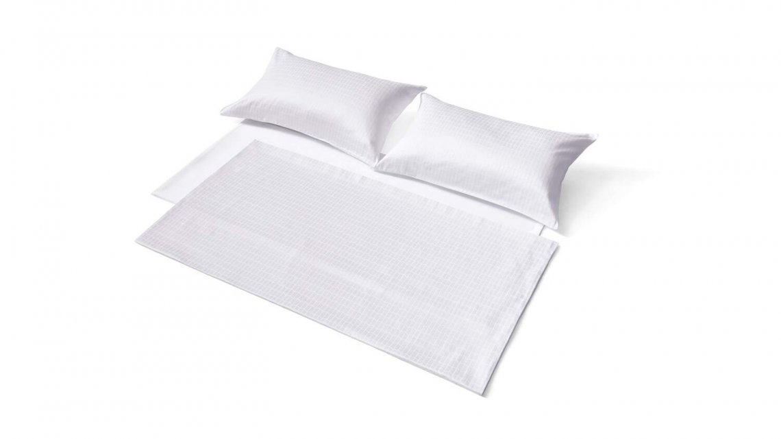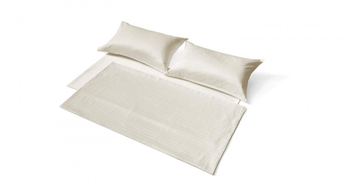 兩款圖案和三種顏色可選的被單套裝:兩個圖案均以精美的緯編提花織成,其將形狀和顏色、環境和人以及物體之間相互關聯,巧妙運用光和影,為臥室的陳設增添動感。模塊式的網格應用旨在調和圖形組成,構建視覺秩序。