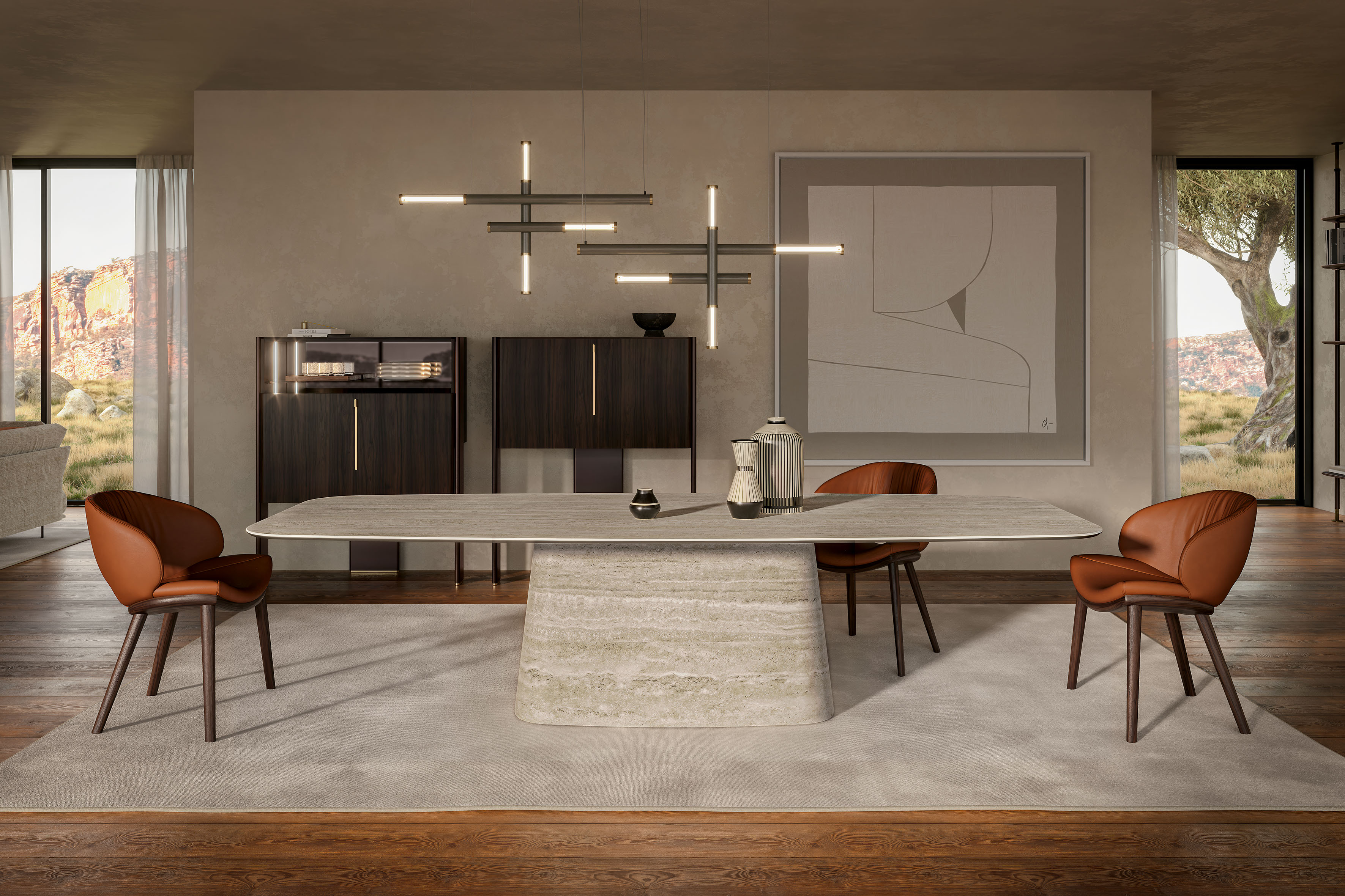 The Napoleon family of tables comes in numerous versions to meet the most varied aesthetic needs and optimally furnish a modern dining room.The central base has been produced using a cutting-edge ceramic modelling technique, which marks the boundary between before and after on the spectrum of possible outcomes offered by this ever more flexible material. This is the first appearance, in fact, of curved slabs in the Keramik collection, sculpted to create bases for ceramic tables with gracefully curved shapes and rounded edges.