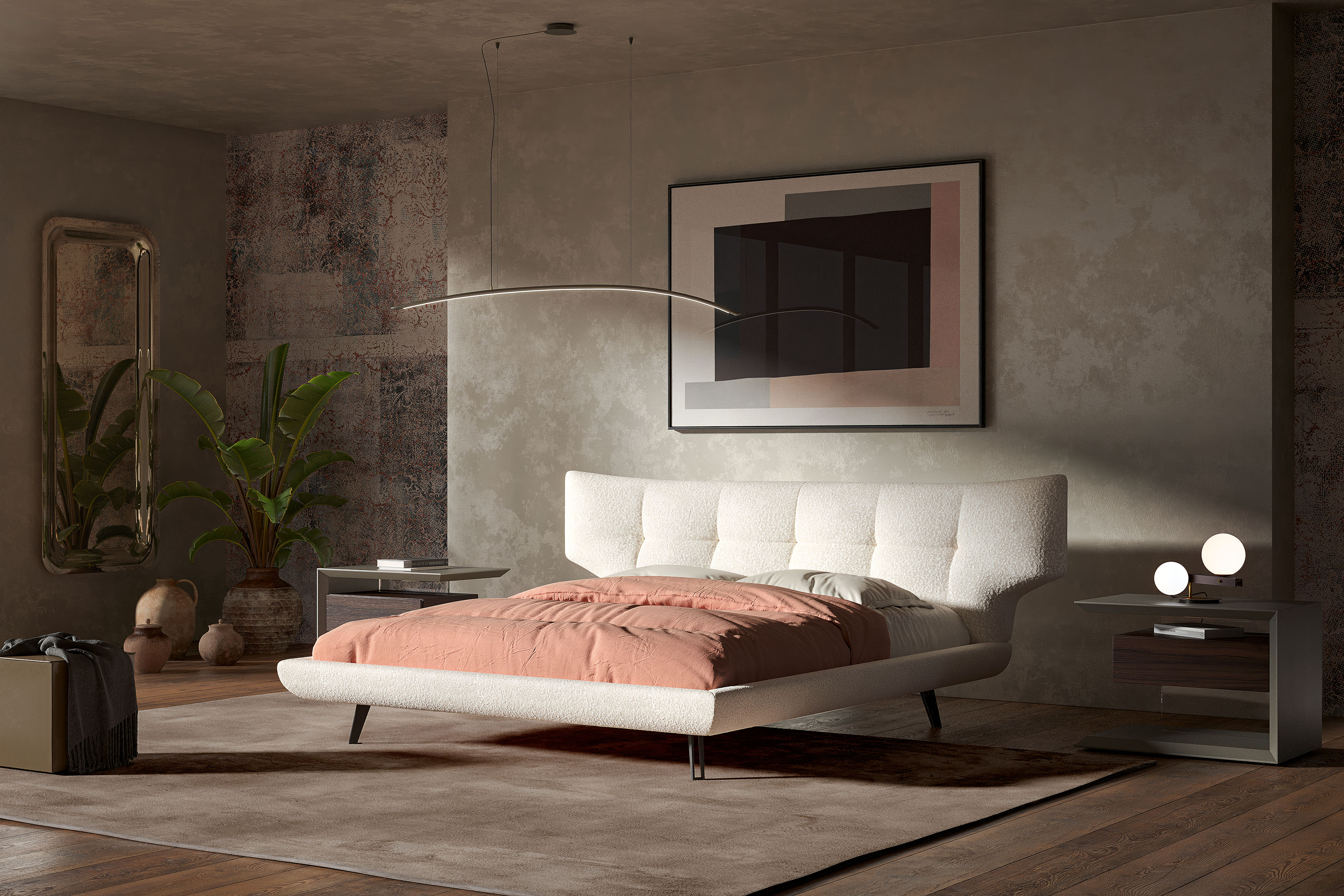 Designed by Maurizio Manzoni, the Thomas designer bed reminds us of an anthropomorphic figure. The headboard, which juts out at the sides, has curves and indentations that create a shell with clearly delineated contours. At the same time, the soft upholstery softens its shape, also as a result of its elegant patterning with wide stitching in a quilted effect.