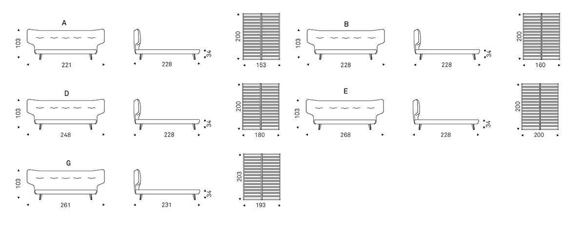 The raised bed frame is finished in fabric or leather like the headboard and supported by metal feet. There is a pleasing contrast between the rounded corners of the upholstery and the square shape of the metal feet, which have a central slit.The result is a sophisticated modern double bed that combines aesthetic elegance and design quality to perfection.