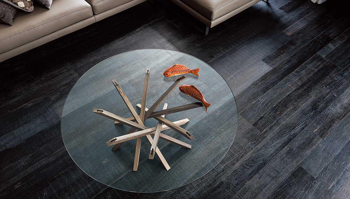 Coffee table with solid Canaletto walnut (NC) or burned oak (RB) stained walnut. Clear glass top. The top is laid on the base.