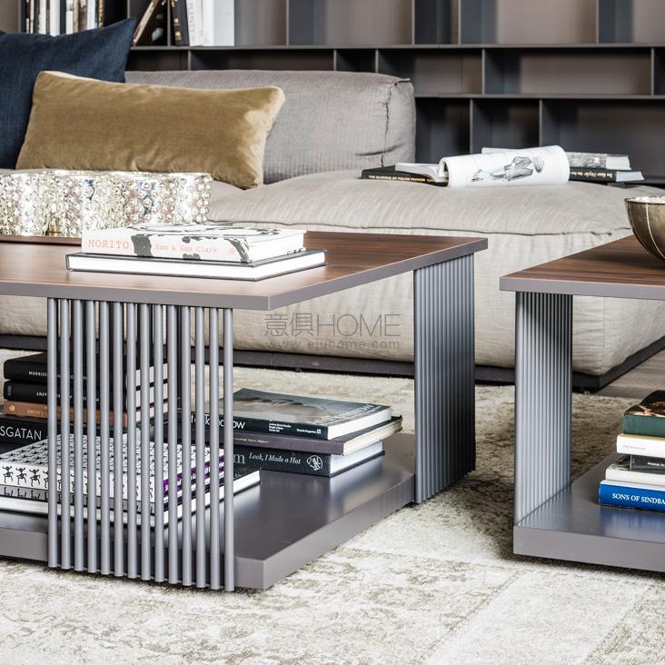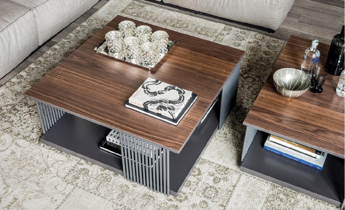 Coffee table with embossed graphite (GFM69) painted steel. Canaletto walnut (NC) upper shelf and embossed graphite (GF69) lacquered lower shelf.