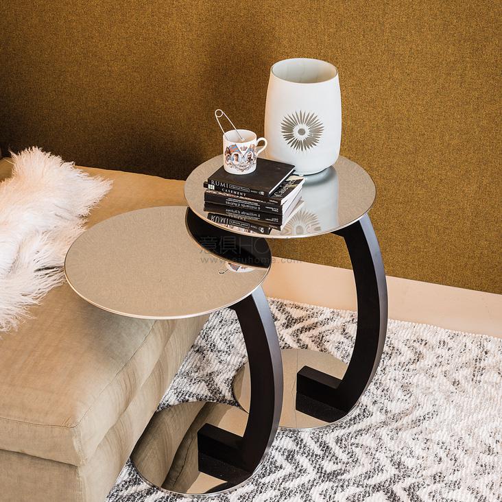 Side table with polished stainless steel base and leg in wenghè (FW) stained solid beech. Top in polished stainless steel or in clear.