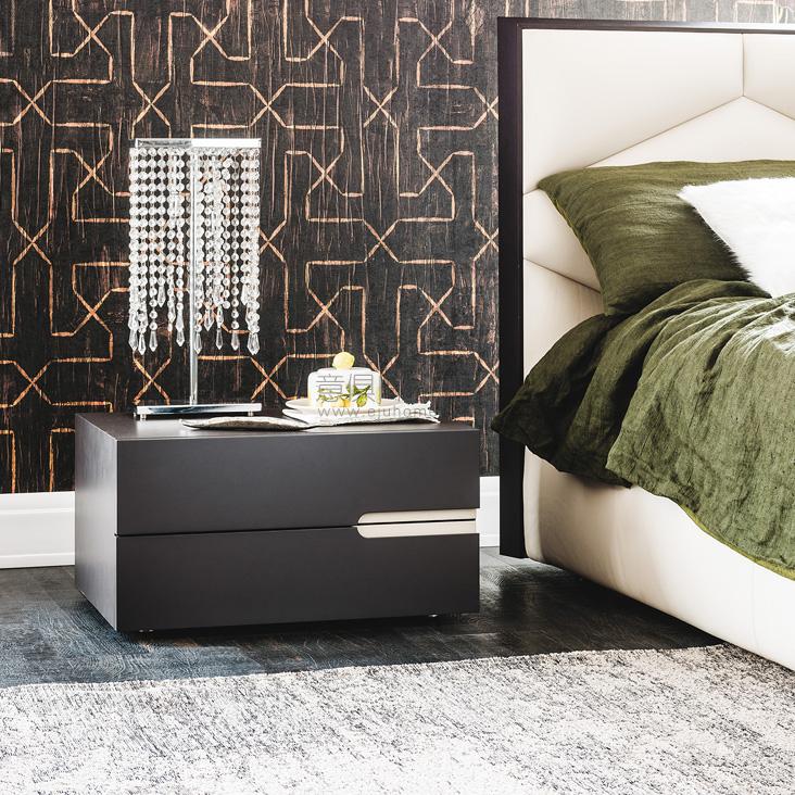 Nightstand in two sizes and two heights with 2 drawers, dresser with 4/8 drawers with frame and fronts in oyster (GF50) or graphite (GF69) embossed lacquered wood, or Canaletto walnut (NC) or burnt oak (RB). Inserts in synthetic leather or soft leather as per our sample cards. A Version with graphite (GFM69) embossed lacquered steel base.