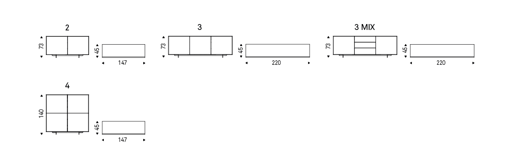 Sideboard with wooden frame in white (OP7) or graphite (OP69) lacquered wood. Doors and drawers in Canaletto walnut (NC) or burned oak (RB). Black embossed painted steel feet (GFM73). Internal clear glass shelves. Optional: internal drawer in each door. In the 4 version, optional internal drawer only in the two lower doors.