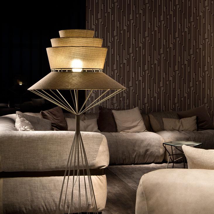 Ceiling lamp, floor lamp and table lamp with matt black (OP17) painted steel or nickel frame. Lampshade fabric in ivory, brown or black colour. Bulb not included.