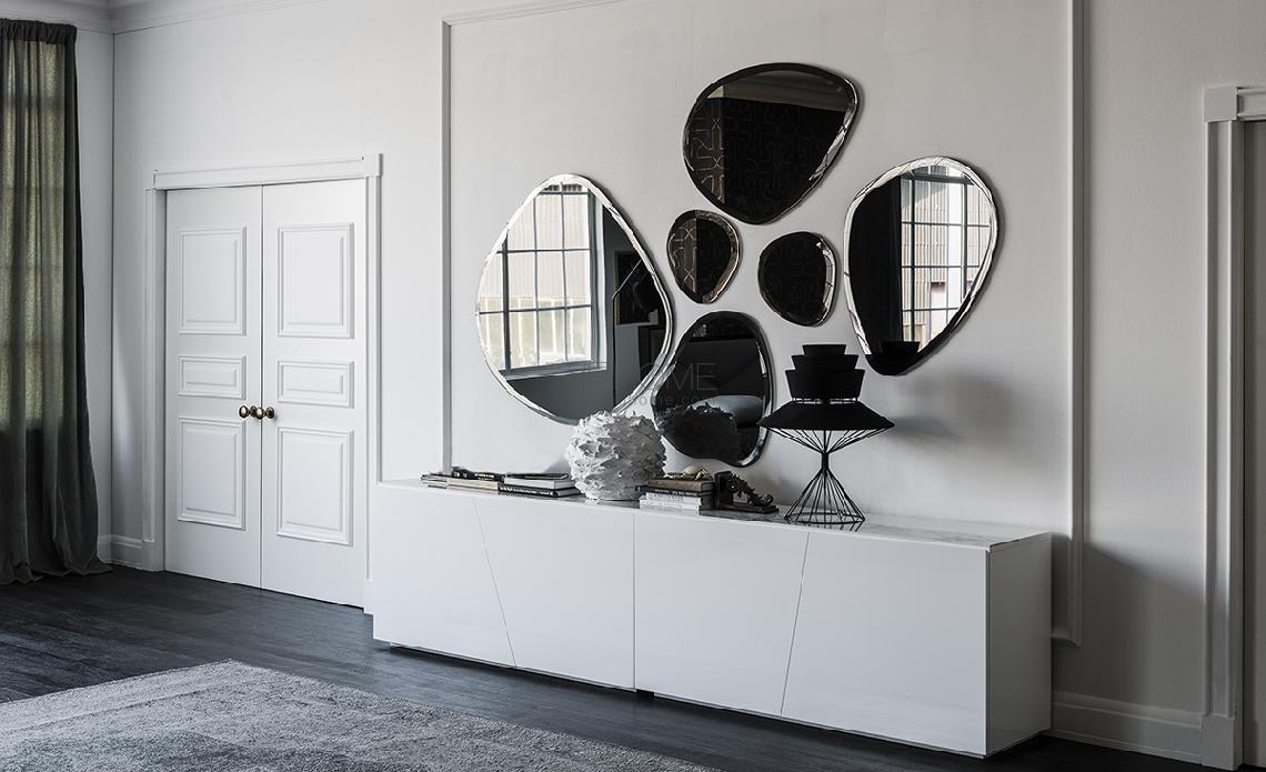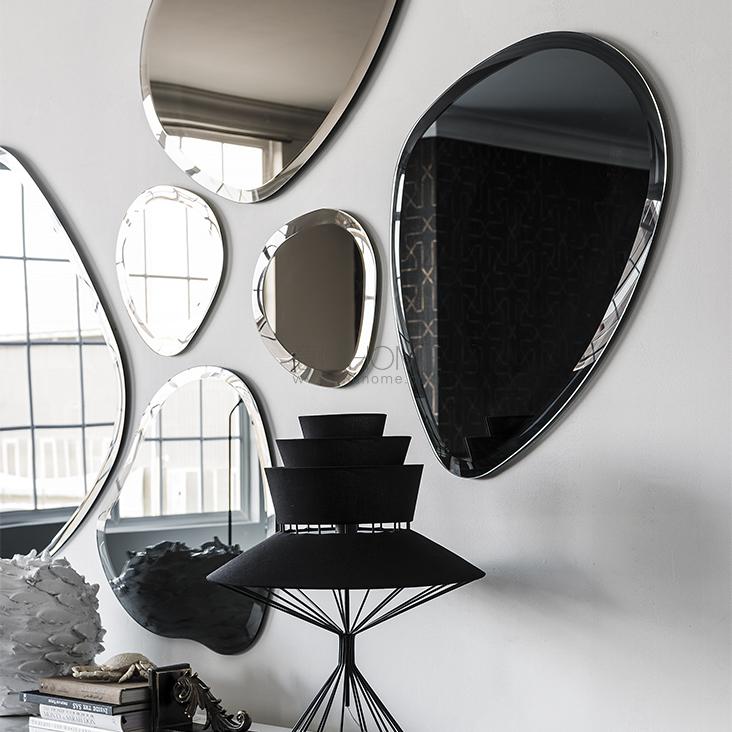 Wall mirror in mirrored, smoked grey or bronze mirrored glass with bevelled edges. Wall bracket with fixing possibilities in different positions.