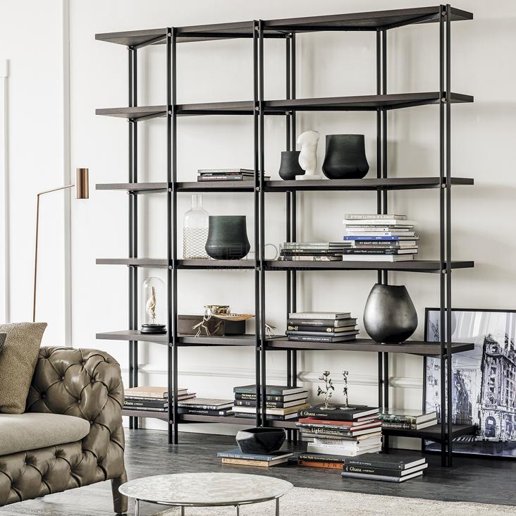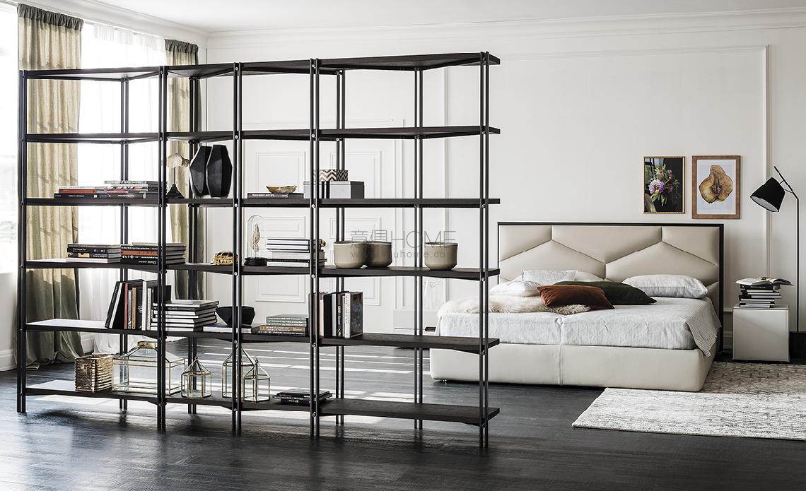 Modular bookcase with frame in titanium (GFM11), graphite (GFM69), white (GFM71) or black (GFM73) embossed lacquered steel. Shelves in Canaletto walnut (NC) or burned oak (RB) or embossed graphite (GF69) or white (GF71) painted wood. Satin bronze laquered steel details. For the freestanding use at least two modules are recommended.