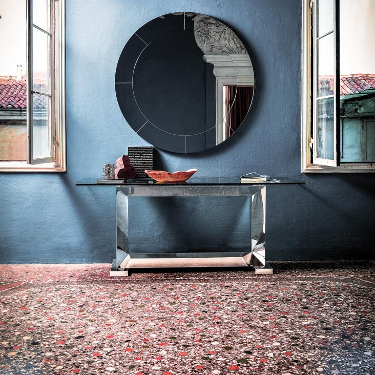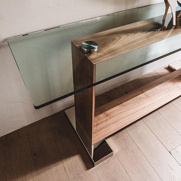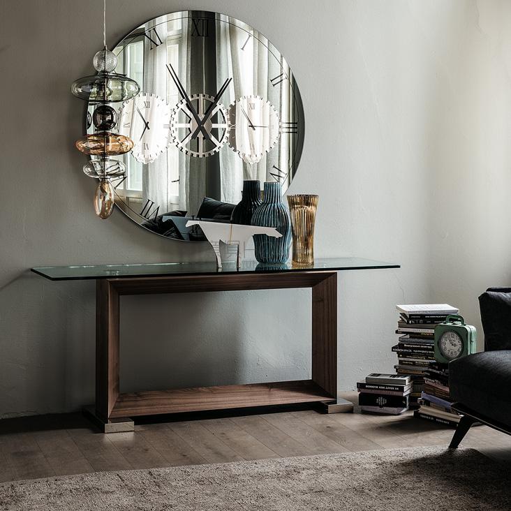 Console with base in Canaletto walnut (NC), burned oak (RB) or polished stainless steel. Polished stainless steel feet. Top with plates in 15mm clear glass. Small reflection irregularities on the stainless steel base are due to manual processing.