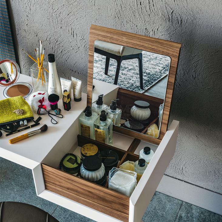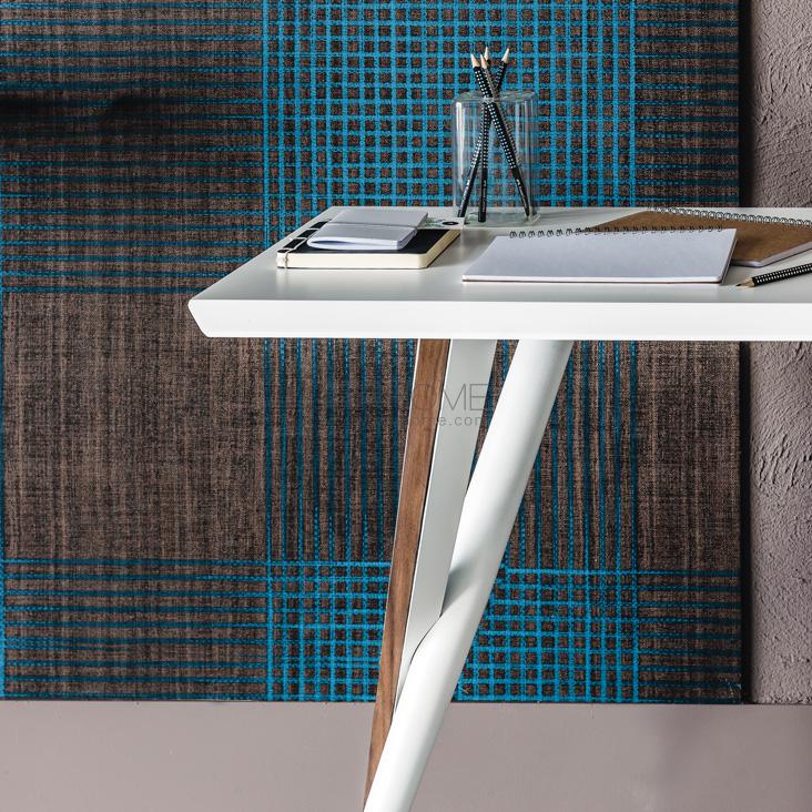 Desk with base in graphite (GFM69) or white (GFM71) embossed lacquered steel with profiles in Canaletto walnut (NC). Top in white (GF71) or graphite (GF69) embossed lacquered wood with container in Canaletto walnut (NC).
