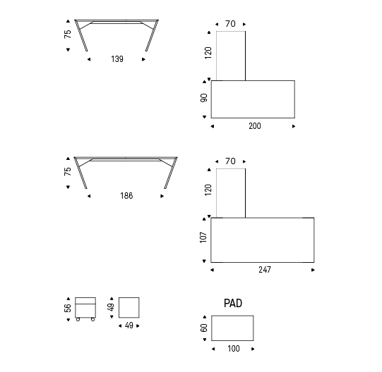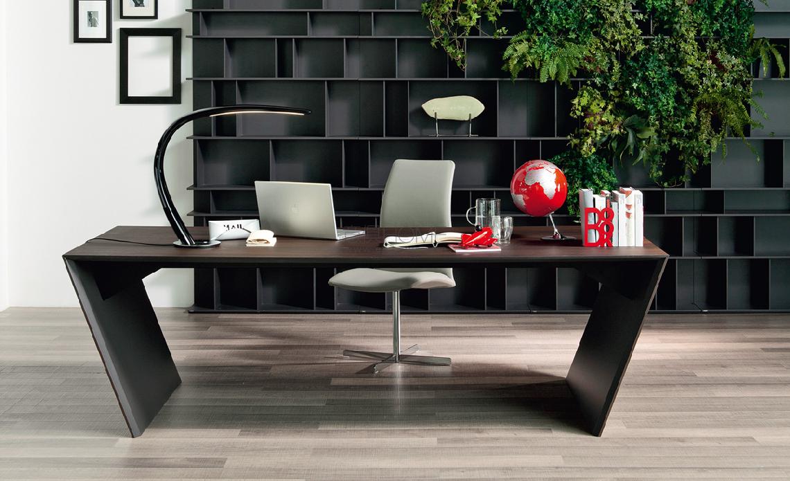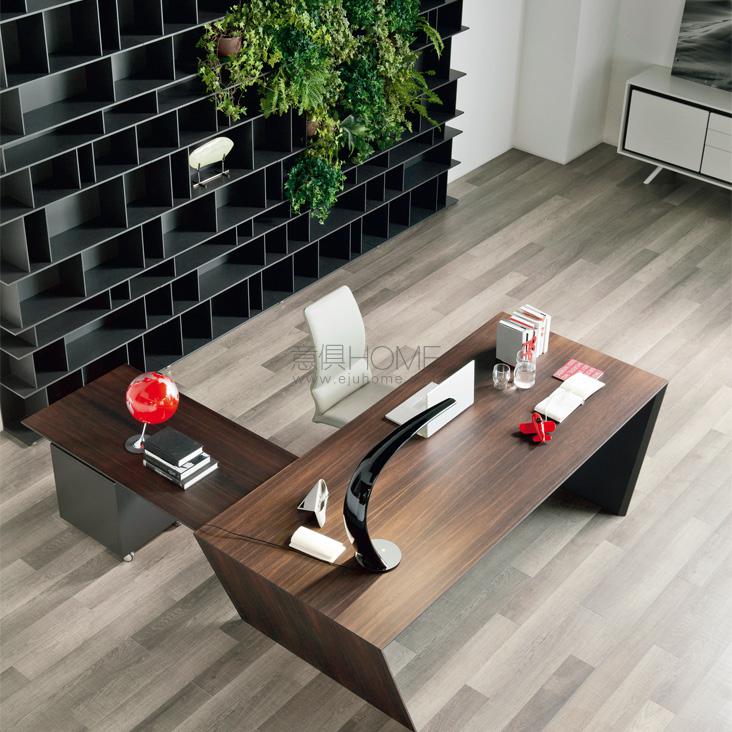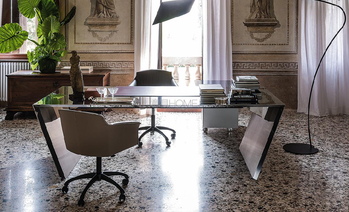 Desk in polished stainless steel or covered in Canaletto walnut (NC) or burned oak (RB) with inner sides painted in matt graphite (OP69). Optional accessories: peninsula in the same finish as the desk (to be supported by drawer-unit), two-drawer-unit on wheels with silver (F12) or graphite (OP69) lacquered structure and front part of the drawers in leather as per sample card, pad in leather as per sample card. Small reflection irregularities on the desk in polished stainless steel version are due to manual processing.