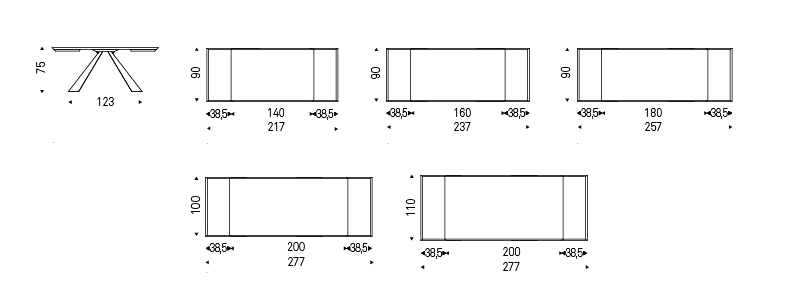 Extendible table with base in titanium (GFM11), bronze (GFM18), graphite (GFM69), white (GFM71) or black (GFM73) embossed lacquered steel. Top and extensions with angled edges in Canaletto walnut (NC) or burned oak (RB).