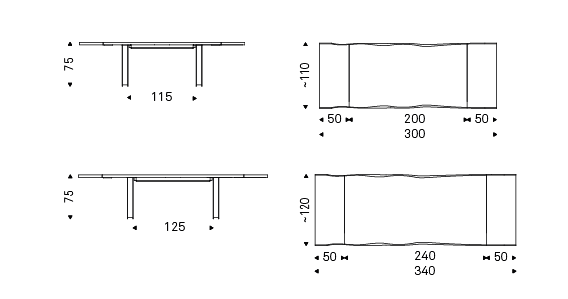 Extendible table with transparent varnished metal (OP0) base. Top and extensions in Canaletto walnut (NC), burned oak (RB) or natural oak (RN) with solid irregular edges. The finish of the base OP0 identifies a transparent coating on ferrous raw material. The presence of more or less obvious stains, colour variations, scratches and irregular edges is feature of the special material processing and should not be considered a defect.