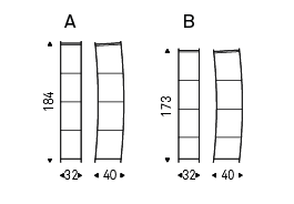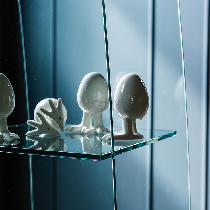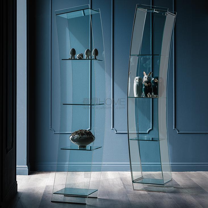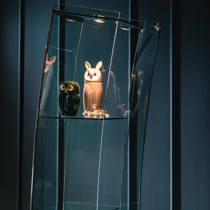 Clear glass showcase with curved door and back with steel details. With led light. Max capacity: each shelf kg 7.