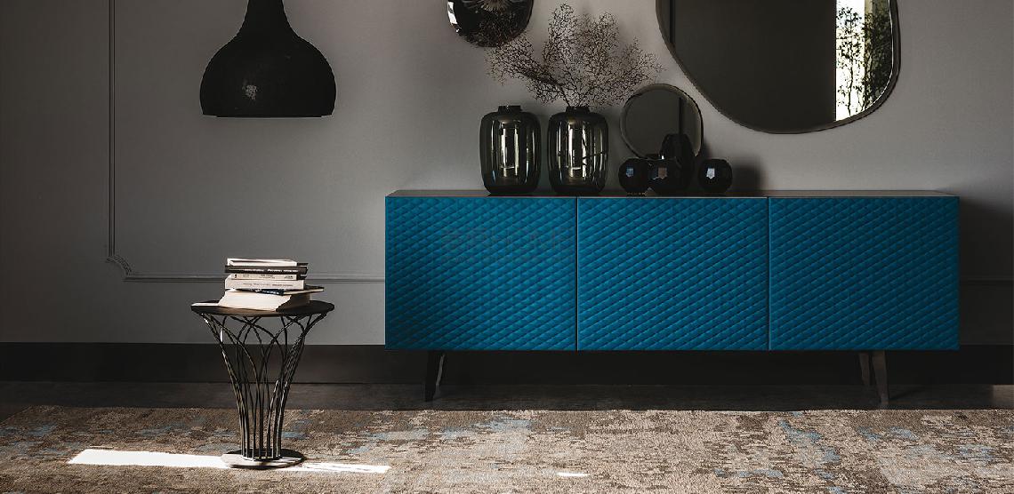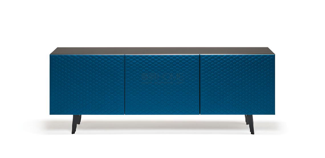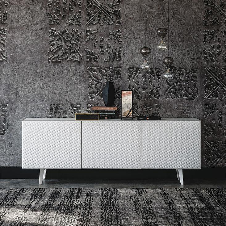Sideboard 2 or 3 doors in lacquered graphite (GF69), white (GF71), black (GF73) embossed wood or lacquered titanium (M11) wood. Embossed steel base in the same color or lacquered titanium. Doors covered and quilted in synthetic leather or soft leather as per sample card with embossed titanium (GFM11) aluminum profiles. Internal clear glass shelves. Optional: internal drawer in each door. Optional: top in frosted glass painted in the same color of the structure.