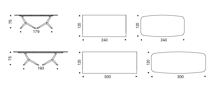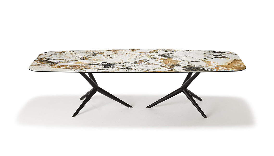 Table with titanium (GFM11), bronze (GFM18), graphite (GFM69) or black (GFM73) embossed lacquered steel base. Feet in black chrome (06). Top in ceramic Marmi Calacatta (KM01), Alabastro (KM02), Ardesia (KM04), matt Golden Calacatta (KM05), glossy Golden Calacatta (KM06), matt Portoro (KM07), glossy Portoro (KM08), glossy Sahara Noir (KM09), Emperador (KM10), Makalu (KM11), Breccia (KM12) or Arenal (KM13).