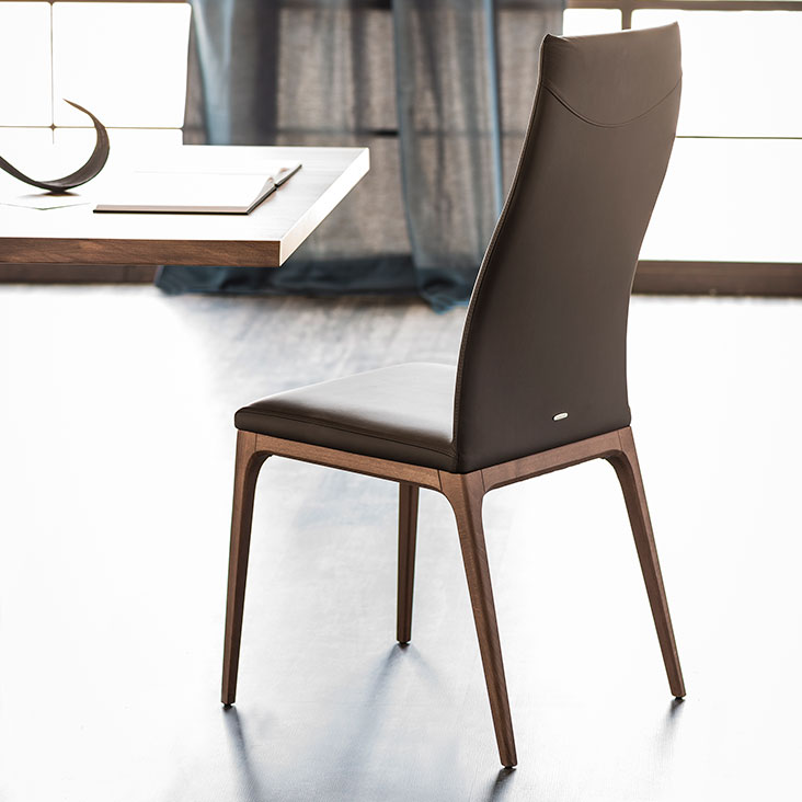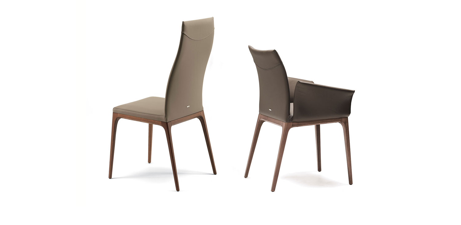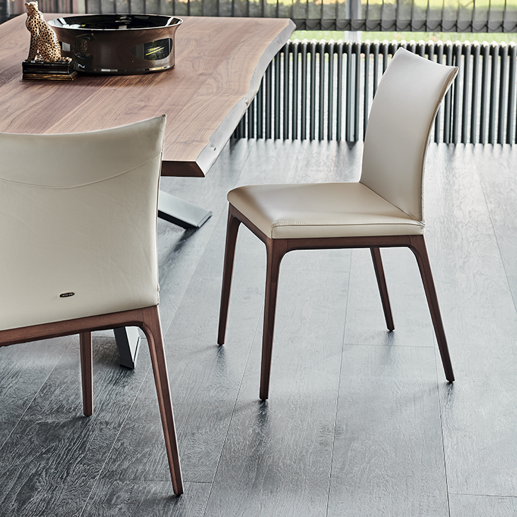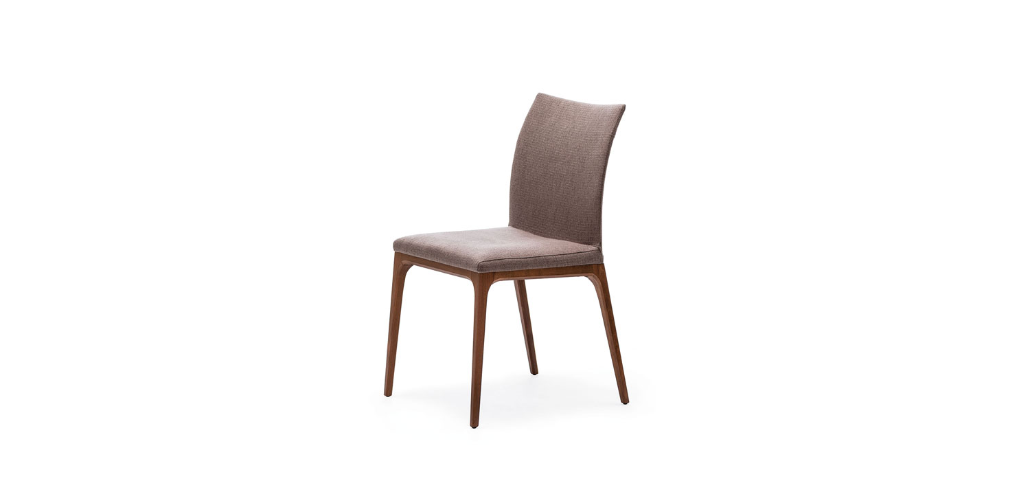 Chair with or without arms with frame in natural beech (F1), Canaletto walnut (FNC), wenghè (FW), matt white (OP7) or black (OP17) stained beech. Cover in fabric, synthetic nubuck, micro nubuck, soft leather or synthetic leather as per sample card. The cover is not removable.