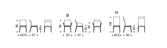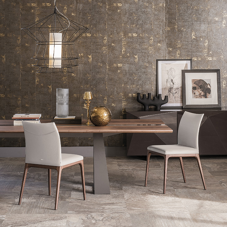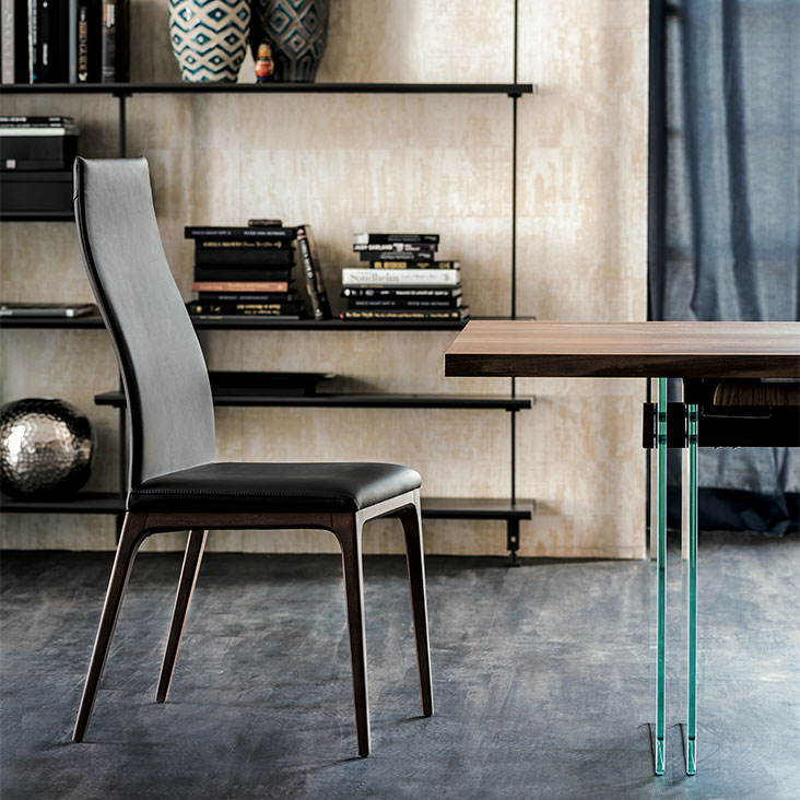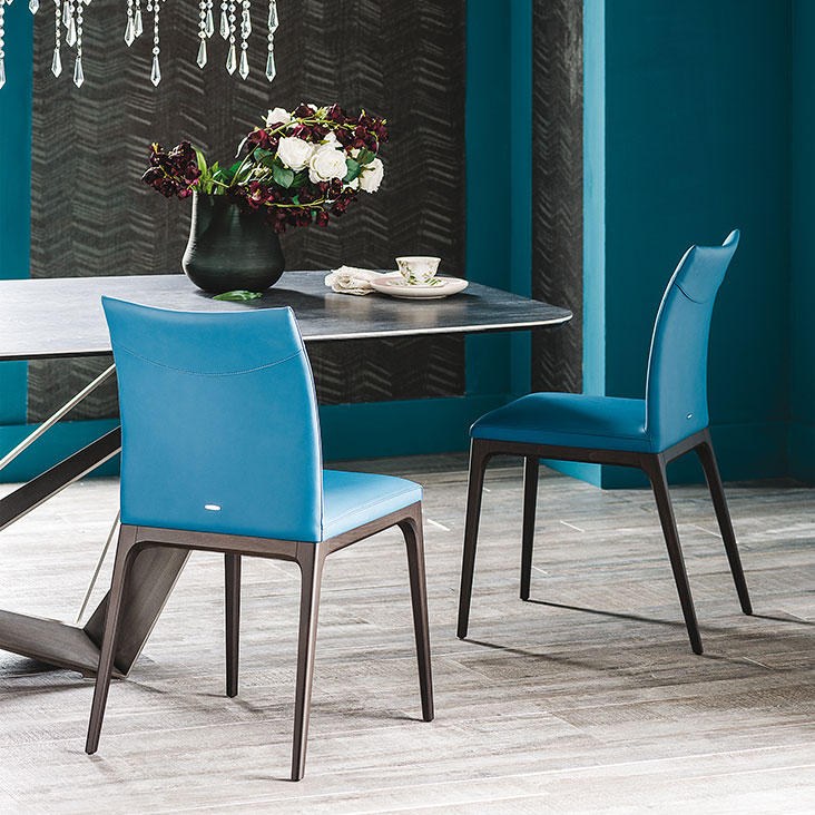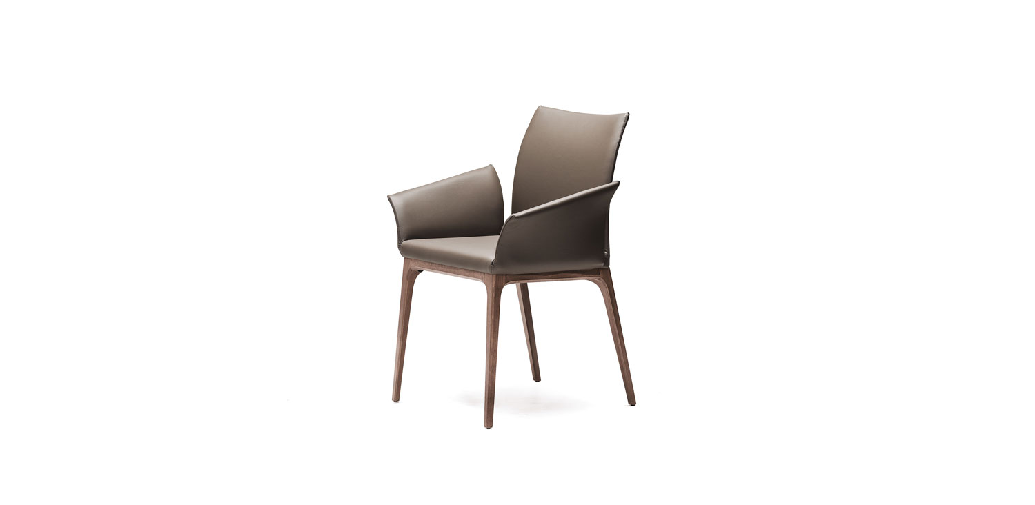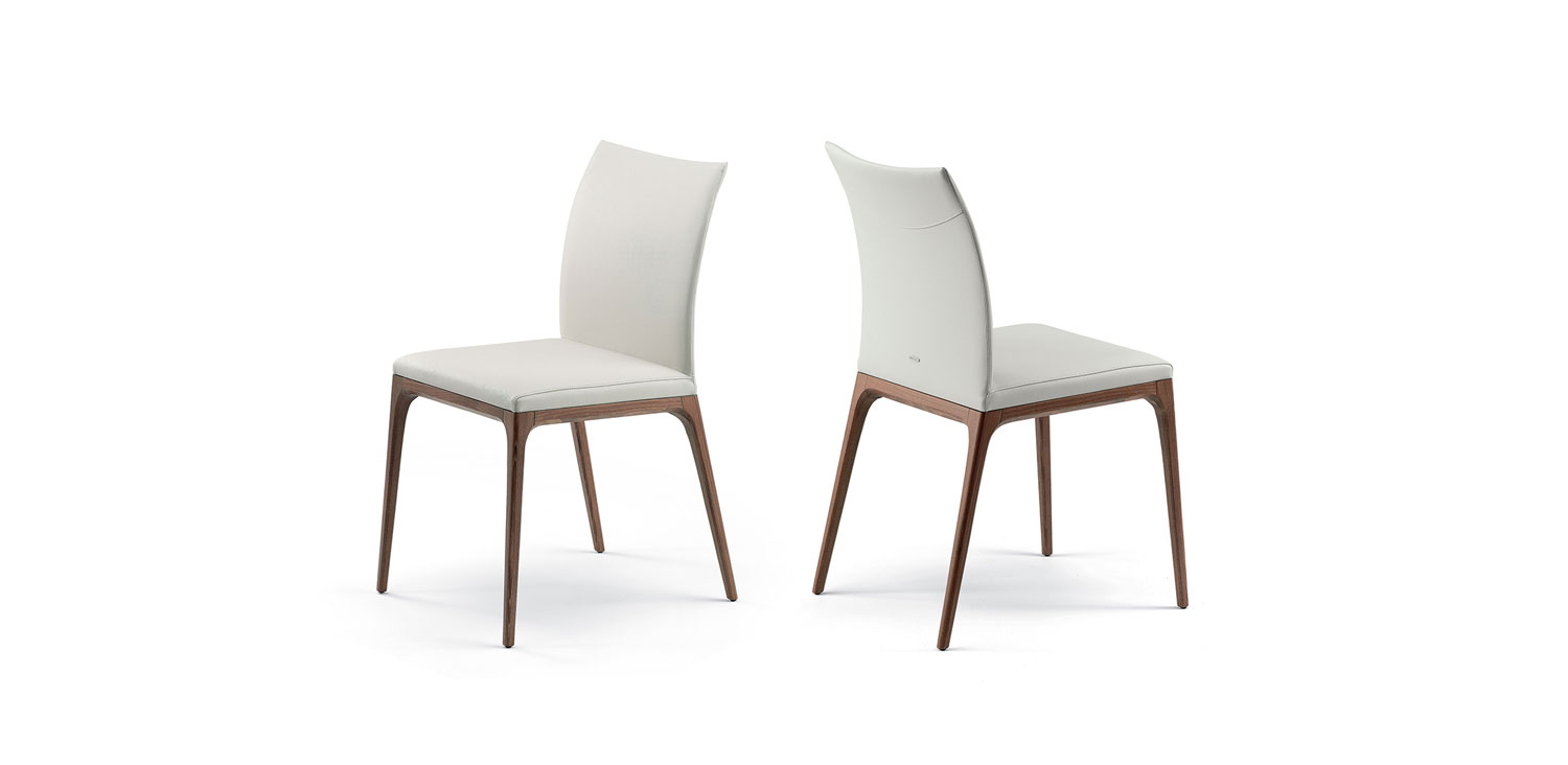 Chair with or without arms with frame in natural beech (F1), Canaletto walnut (FNC), wenghè (FW), matt white (OP7) or black (OP17) stained beech. Cover in fabric, synthetic nubuck, micro nubuck, soft leather or synthetic leather as per sample card. The cover is not removable.