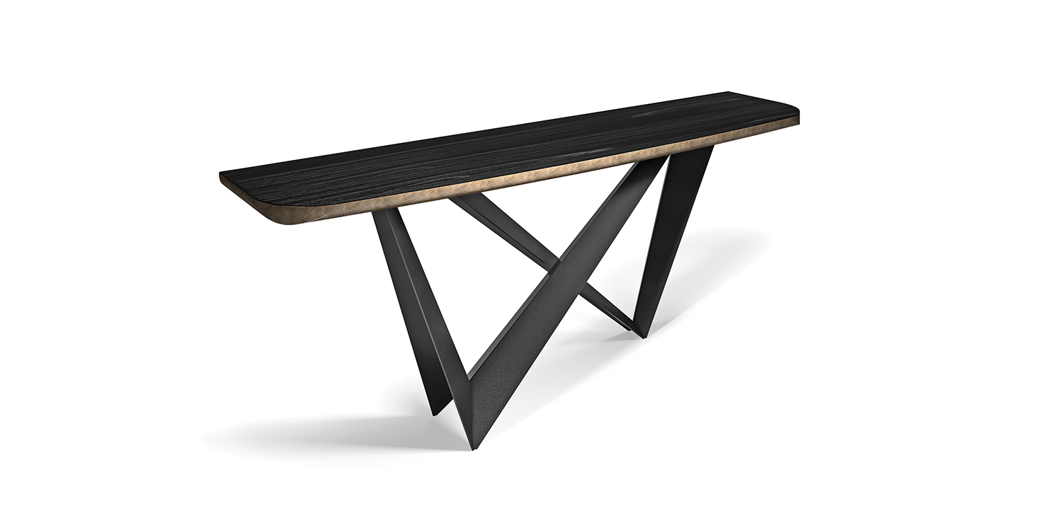 Console with base in titanium (GFM11), bronze (GFM18), graphite (GFM69), white (GFM71), black (GFM73) or mix (GFM69-GFM71) embossed lacquered steel, Brushed Bronze or Brushed Grey steel. Top in Canaletto walnut (NC) with Brushed Grey lacquered and rounded lower profile or elm open pore matt black (OLM73) with Brushed Bronze lacquered and rounded lower profile. Wall anchorage is necessary.