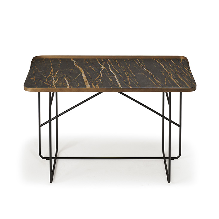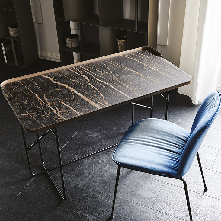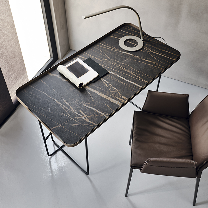 Desk with base and top frame in titanium (GFM11) or black (GFM73) embossed lacquered steel, or with base in black (GFM73) embossed lacquered steel and Brushed Bronze top frame. Top in ceramic Marmi Calacatta (KM01), Alabastro (KM02), Ardesia (KM04), matt Golden Calacatta (KM05), glossy Golden Calacatta (KM06), matt Portoro (KM07), glossy Portoro (KM08), glossy Sahara Noir (KM09), Emperador (KM10), Makalu (KM11), Breccia (KM12) or Arenal (KM13).