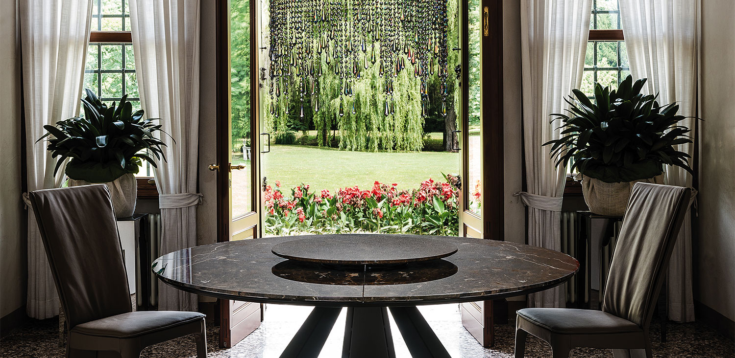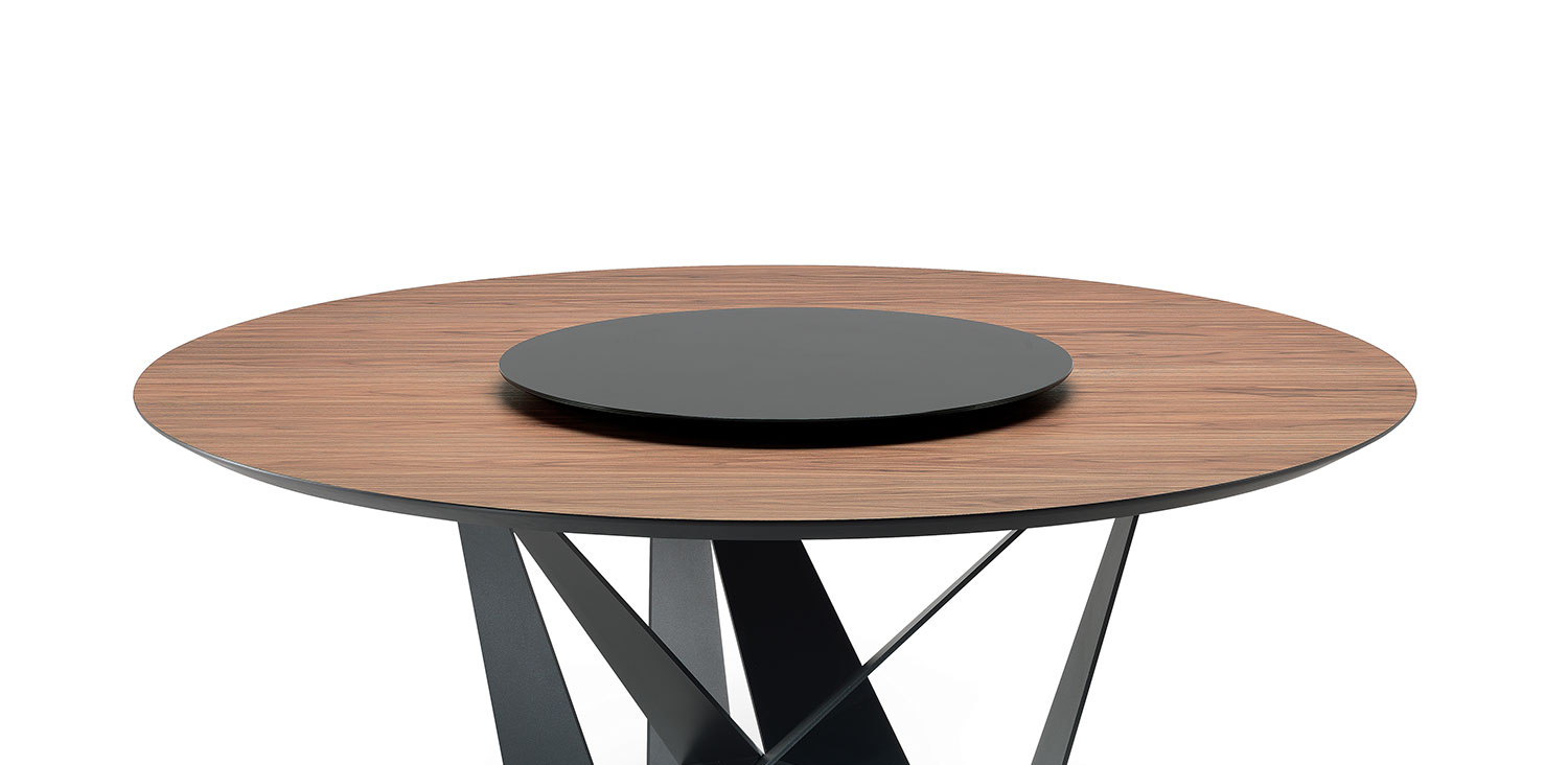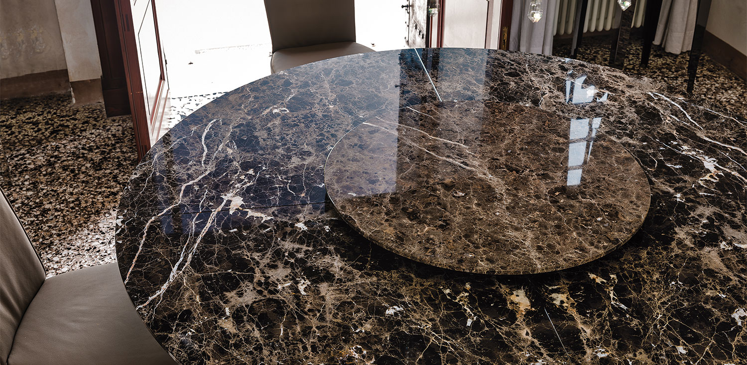 Central swiveling tray in white, black or graphite painted extra clear frosted glass, in Marmi ceramic in Calacatta (KM01), Alabastro (KM02), Ardesia (KM04), Emperador (KM10) or Makalu (KM11), in white Carrara (BC) or Emperador marble (EMP).