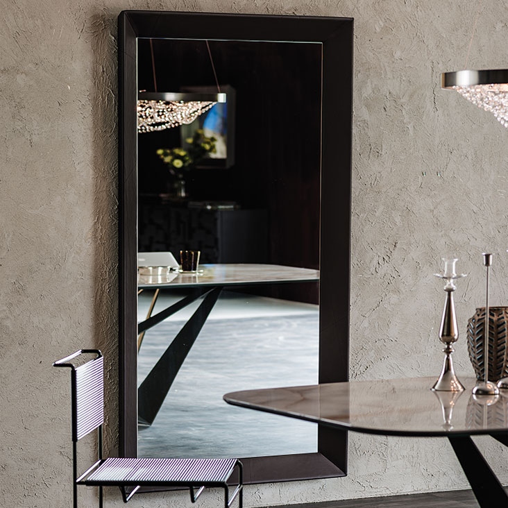 Wall or floor mirror in mirrored or fumé mirrored glass with frame covered in synthetic leather or soft leather as per sample card.