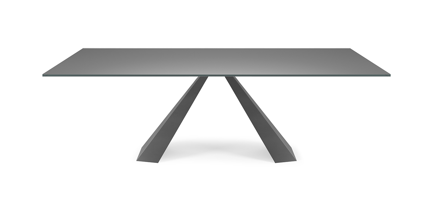 Table with base in titanium (GFM11), bronze (GFM18), graphite (GFM69), white (GFM71) or black (GFM73) embossed lacquered steel. 12mm top in graphite painted frosted extra clear glass or white Carrara (BC) or Emperador (EMP) marble.