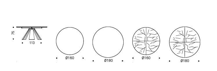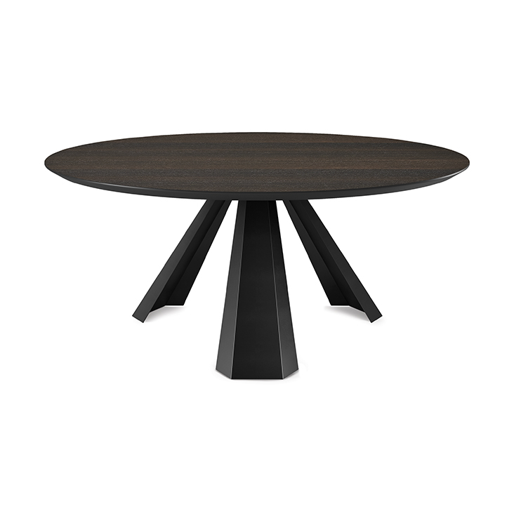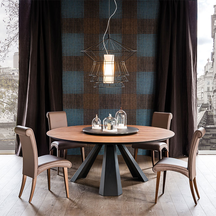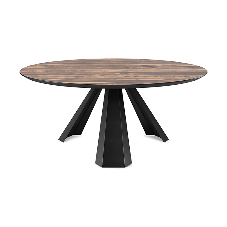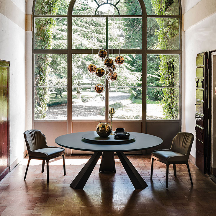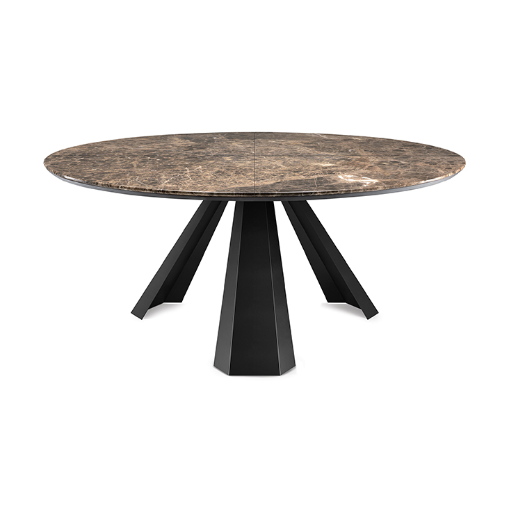 Table with base in titanium (GFM11), bronze (GFM18), graphite (GFM69), white (GFM71) or black (GFM73) embossed lacquered steel. 15mm top in white or graphite painted extra clear frosted glass or white Carrara (BC), Emperador (EMP) marble, Canaletto walnut (NC) or burned oak (RB). Marble tops are composed by four slices. Optional central swiveling tray Lazy Susan
