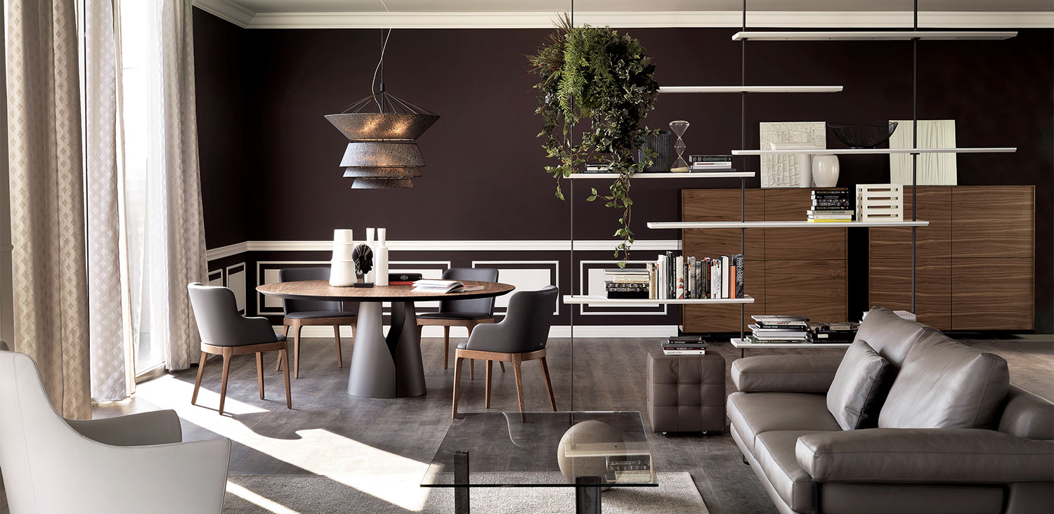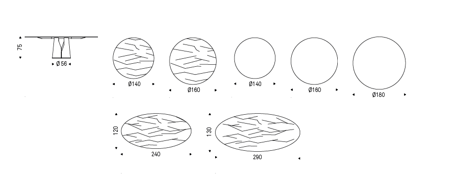 Table with base in titanium (GFM11), bronze (GFM18), graphite (GFM69), white (GFM71) or black (GFM73) embossed lacquered steel. Top in matt white Carrara (BCO) marble, Canaletto walnut (NC) or burned oak (RB) wood. Optional central swiveling tray Lazy Susan.