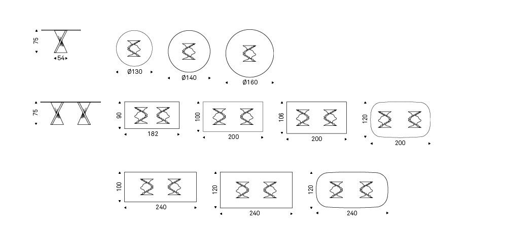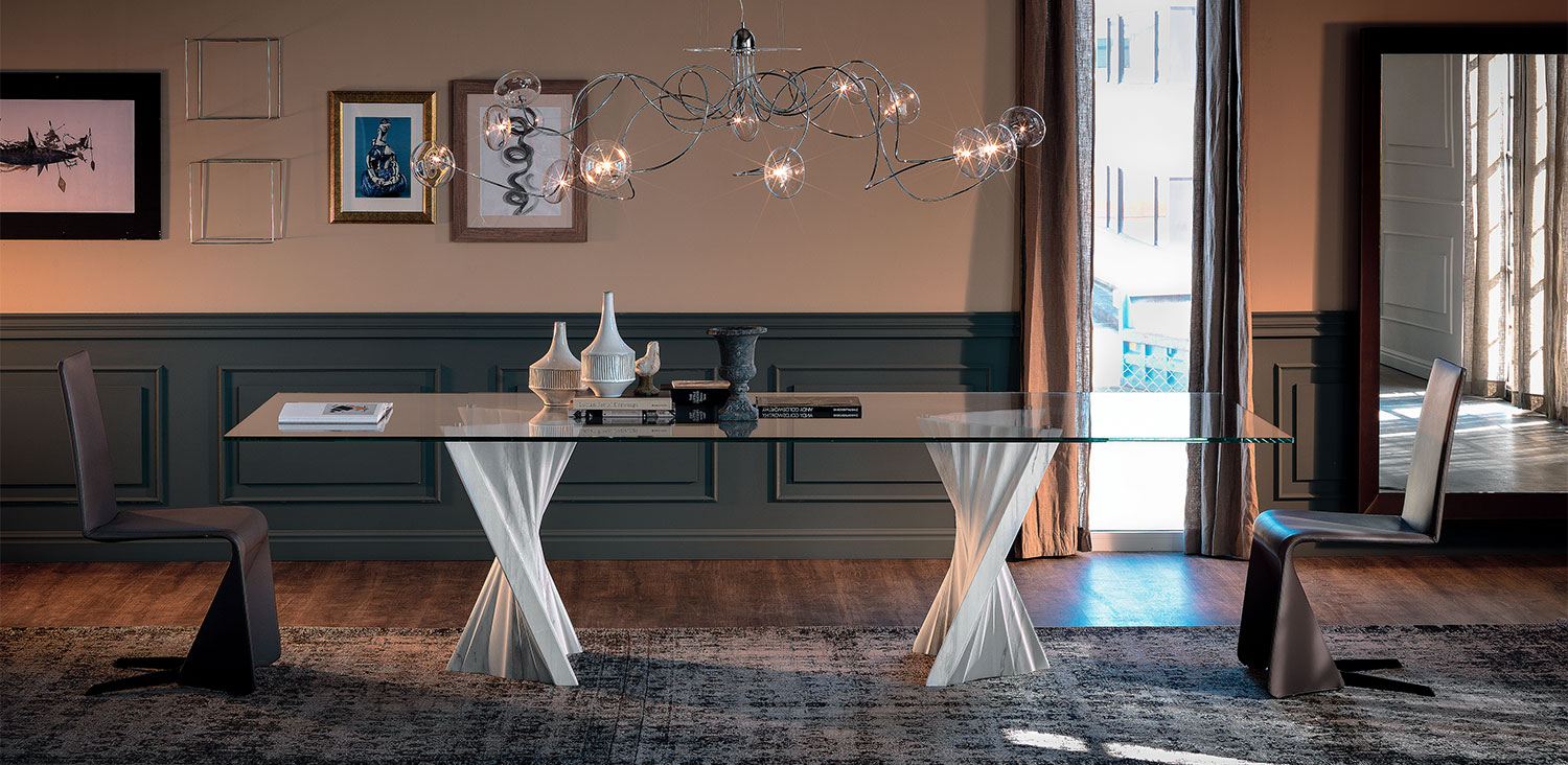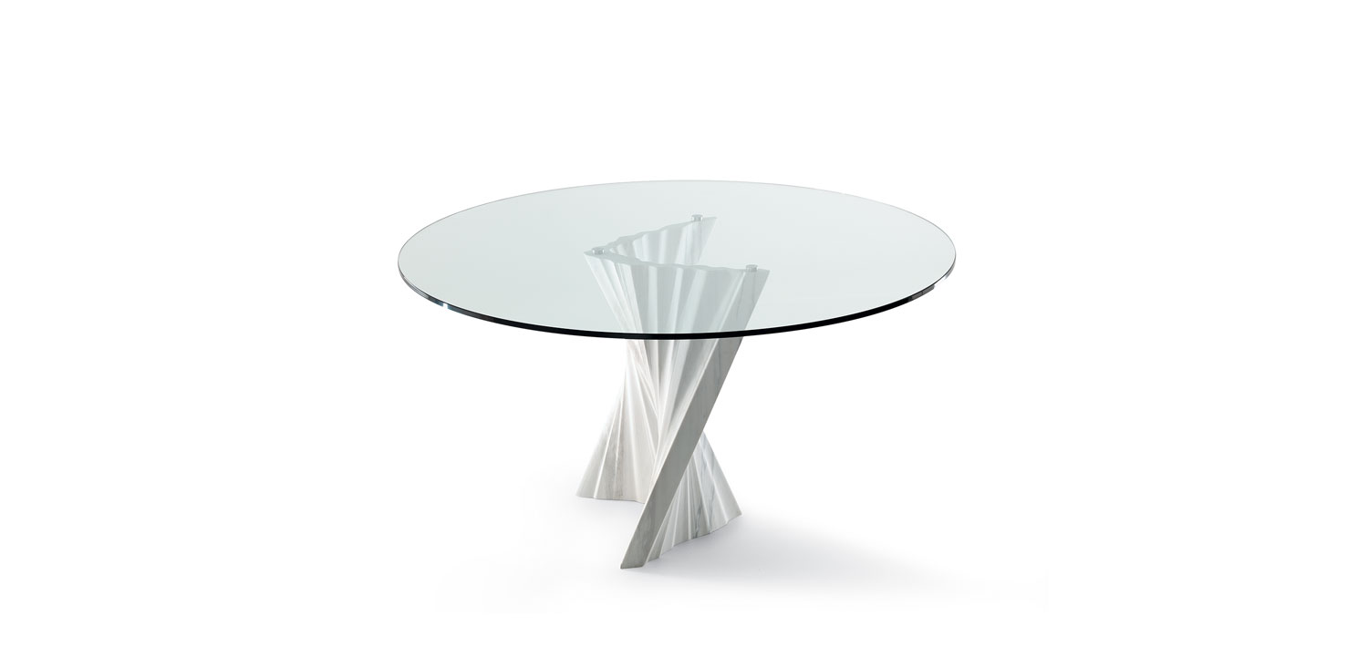 Table with base in matt Palissandro white marble (BPO). Top in 15mm clear or extra clear glass. Glass top in 12mm on 182x90 and 200x106 versions. Top with plates in 1 base version, top laid on the base in 2 bases version.