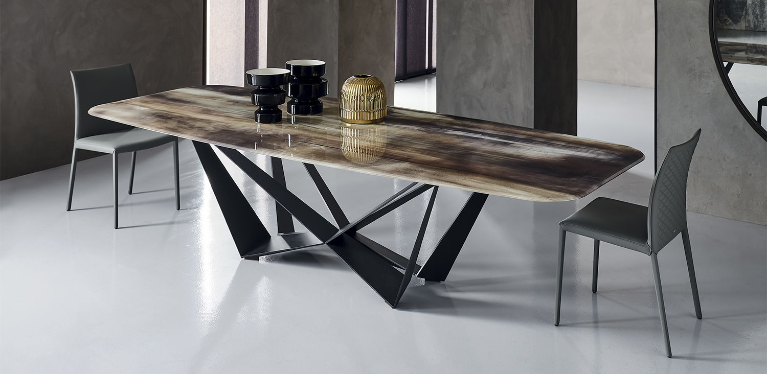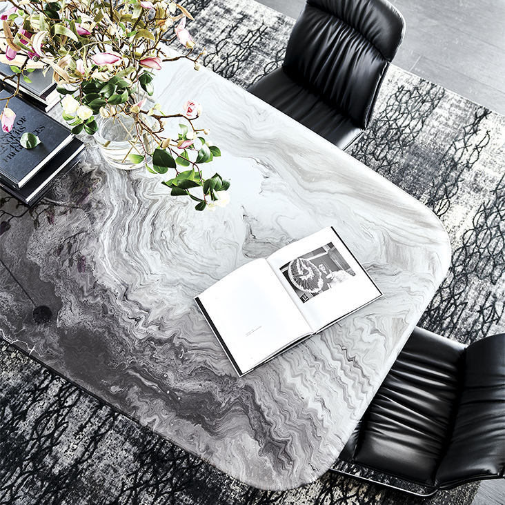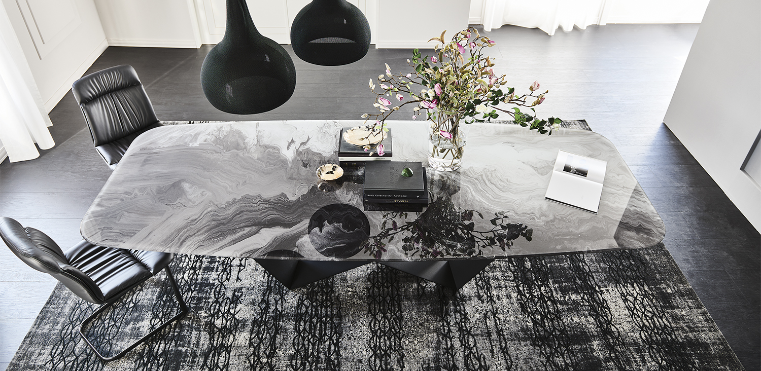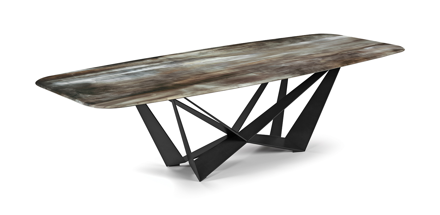 Table with base in titanium (GFM11), bronze (GFM18), graphite (GFM69), white (GFM71), or black (GFM73) embossed lacquered steel, Brushed Bronze or Brushed Grey lacquered steel. Top 12mm thick in extra clear bevelled glass with artistic decorative printing in two different colours (CY01, CY02).