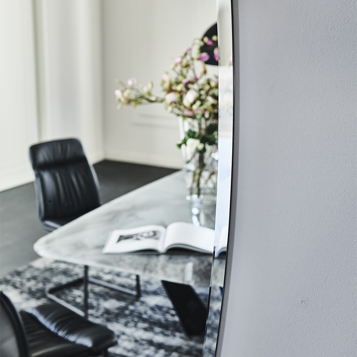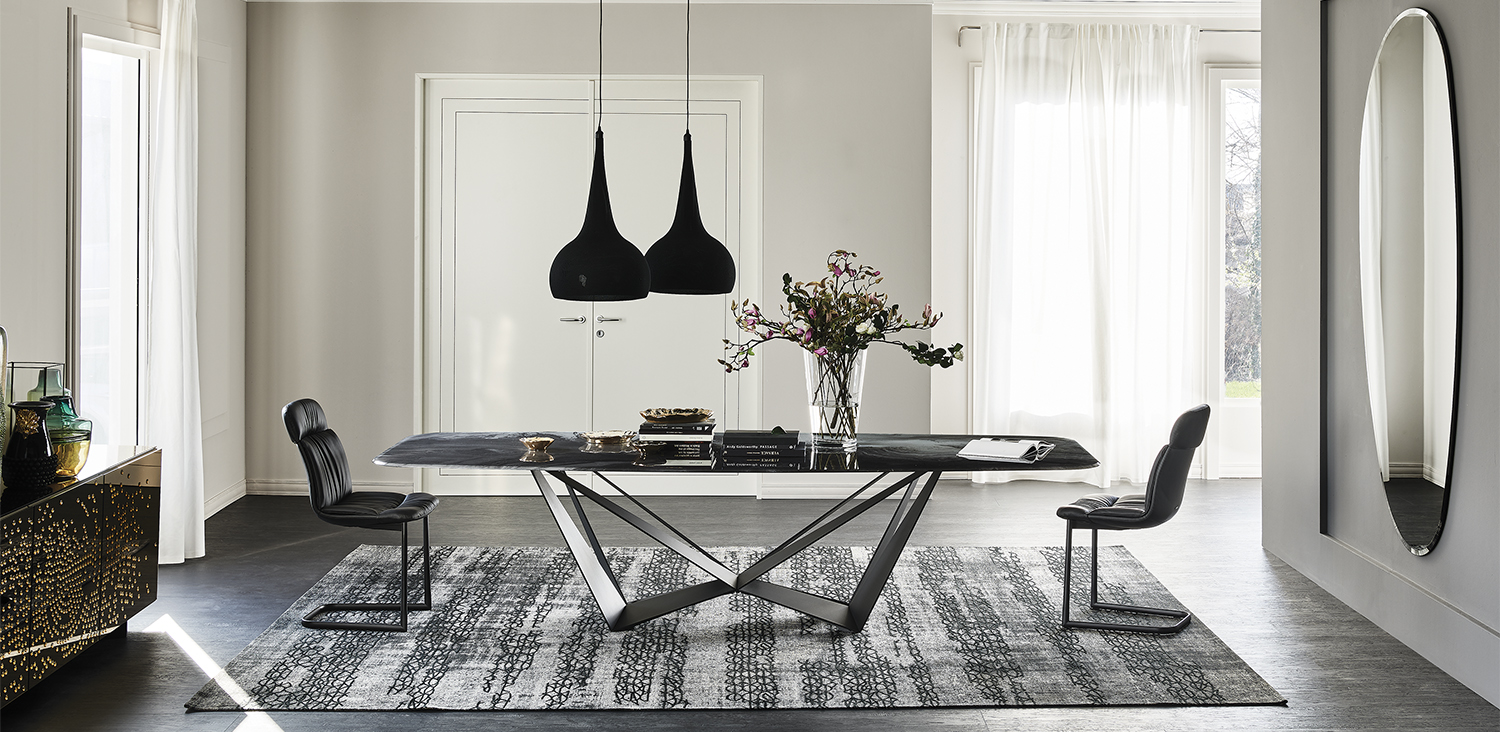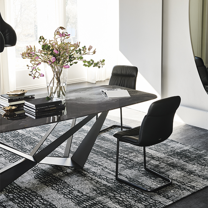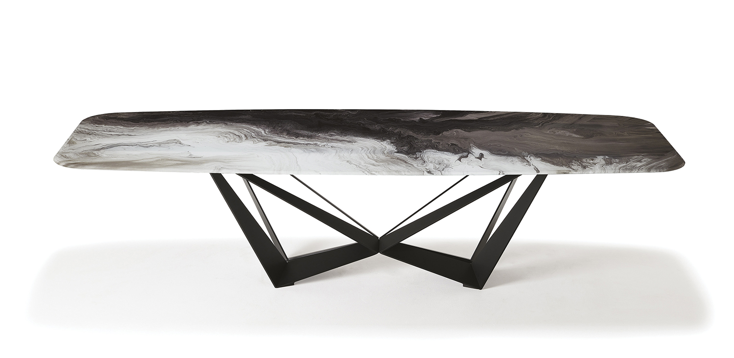 Table with base in titanium (GFM11), bronze (GFM18), graphite (GFM69), white (GFM71), or black (GFM73) embossed lacquered steel, Brushed Bronze or Brushed Grey lacquered steel. Top 12mm thick in extra clear bevelled glass with artistic decorative printing in two different colours (CY01, CY02).