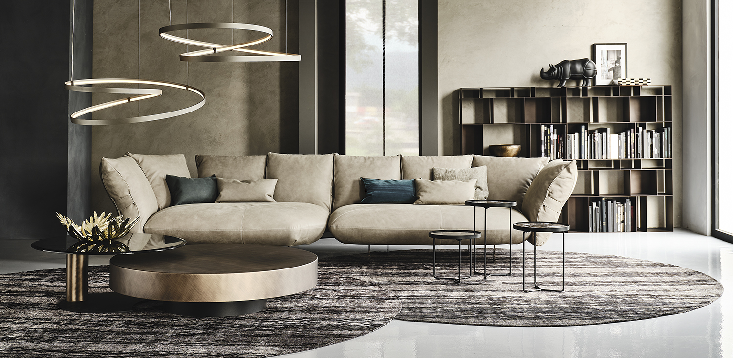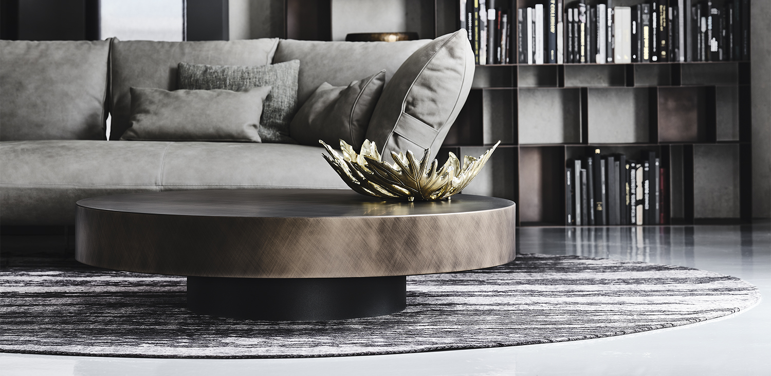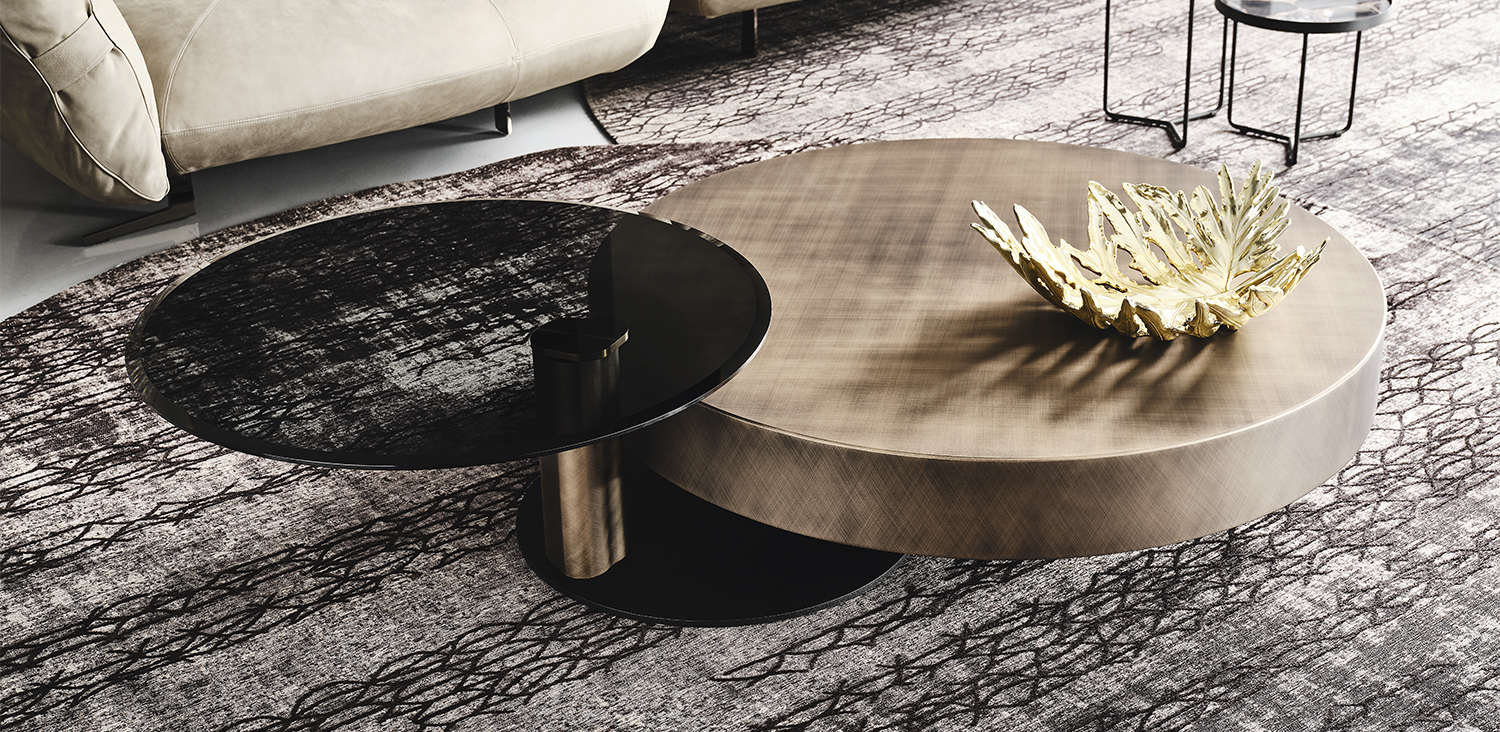 Coffee table with black (GFM73) embossed lacquered steel base and top in Brushed Bronze or Brushed Grey lacquered steel. In BOND and DOUBLE BOND versions, main coffee table is sided by one or two coffee tables with base in black (GFM73) embossed lacquered steel, column in Brushed Bronze or Brushed Grey lacquered steel and swivelling fumé beveled glass top.
